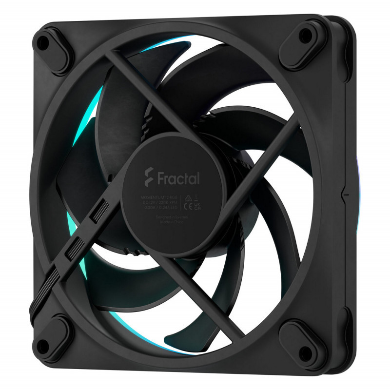 "Fractal Design Momentum 12 RGB. Type: Fan, Fan diameter: 12 cm, Rotational speed (min): 350 RPM, Rotational speed (max): 2200 RPM, Airflow: 106.2 m³/h, Maximum air pressure: 2.42 mmH2O, Bearing type: Fluid Dynamic Bearing (FDB). Product colour: Black"\n"A high-performance fan series developed for powerful airflow. Momentum fans fuse premium materials with performance engineering to minimize noise while maximizing cooling efficiency.