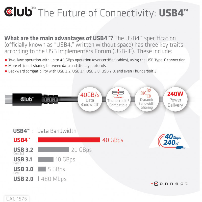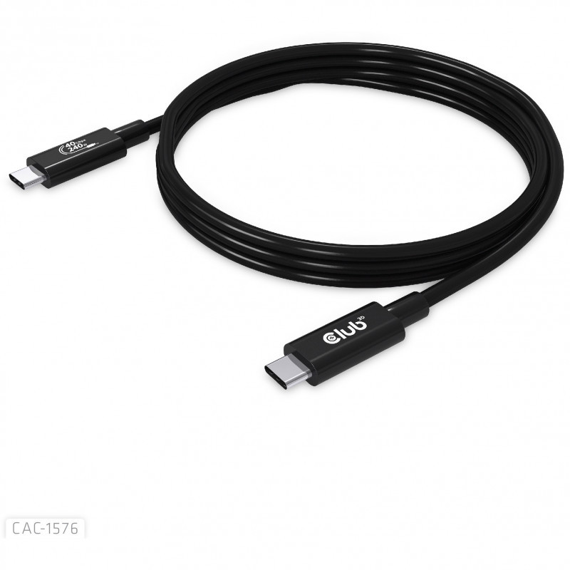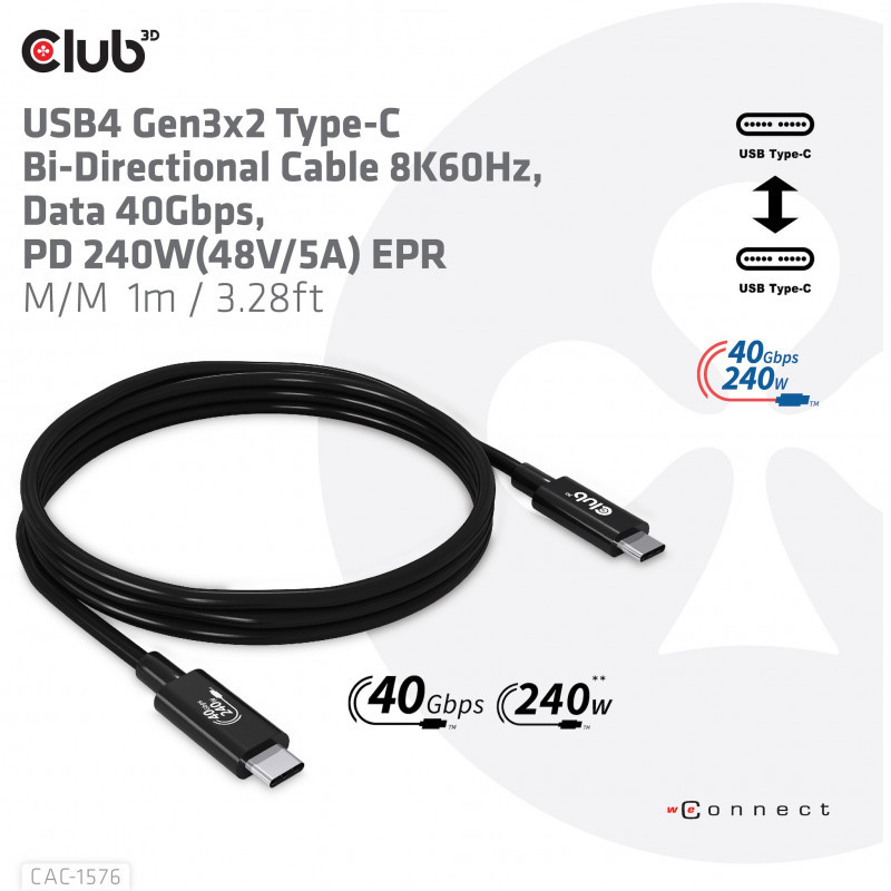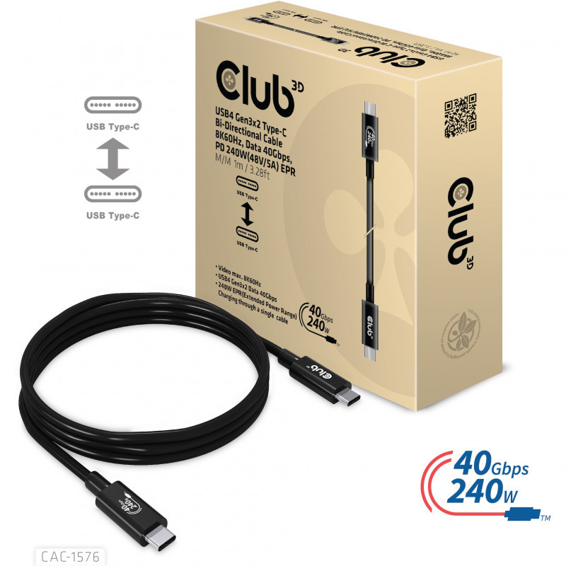 "CLUB3D USB4 Gen3x2 Type-C Bi-Directional Cable 8K60Hz, Data 40Gbps, PD 240W(48V/5A) EPR M/M 1m / 3.28ft. Cable length: 1 m. Connector 1: USB C, Connector 2: USB C, USB version: USB4 Gen 3x2, Maximum data transfer rate: 40 Gbit/s, Product colour: Black"\n"The Club 3D CAC-1576 USB4 Gen3x2 Type-C Bi-Directional USB-IF Certified Cable 8K60Hz, Data 40Gbps, PD 240W(48V/5A) EPR M/M 1m / 3.28ft connects your Notebook, Tablet or Phone with USB4 Type-C output to your favorite existing Peripherals, Accessories and Chargers. It enables Video,Data and Power over a single cable and both ways. This cable supports USB4 Gen3x2 Type-C Bi-Directional Video 8K60Hz, Data 40Gbps, PD 240W(48V/5A) EPR M/M 1m / 3.28ft output for Downstream charging or powering your Notebook, Tablet or Smartphone and is USB-IF Certified."