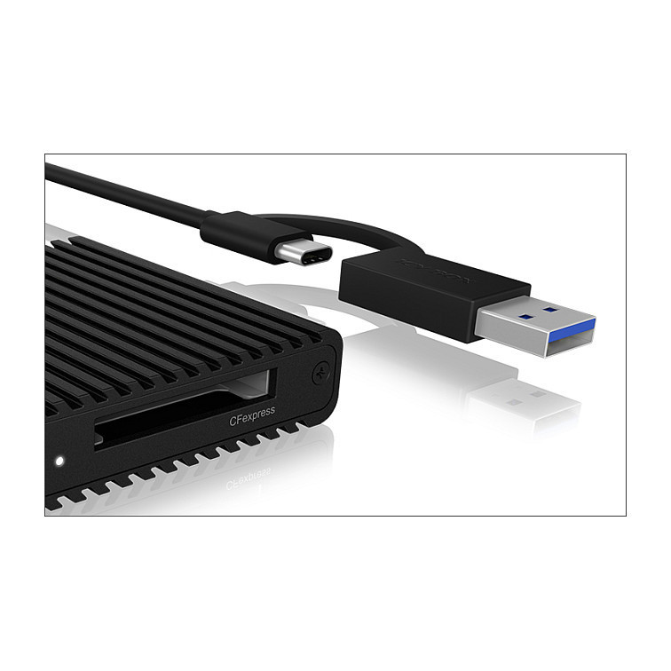 "ICY BOX IB-CR404-C31. Compatible memory cards: CFast 2.0, Product colour: Black, Data transfer rate: 10000 Mbit/s. Width: 64 mm, Depth: 59 mm, Height: 15 mm. Quantity per pack: 1 pc(s), Package width: 27 mm, Package depth: 105 mm. Compatible operating systems: Windows, macOS, ChromeOS. Products per master (outer) case: 40 pc(s)"\n"The new IB-CR404-C31 is a card reader for CFexpress 2.0 Type-B memory cards. With USB 3.2 (Gen 2) and thus up to 10 Gbit/s, it can read and write to CFexpress 2.0 memory cards with NVMe protocol at blazing speed. The USB combination cable ensures broad compatibility with USB Type-C and Type-A connections. The high-quality housing made of solid aluminium is able to optimally dissipate the heat generated by the memory card through the integrated cooling fins.