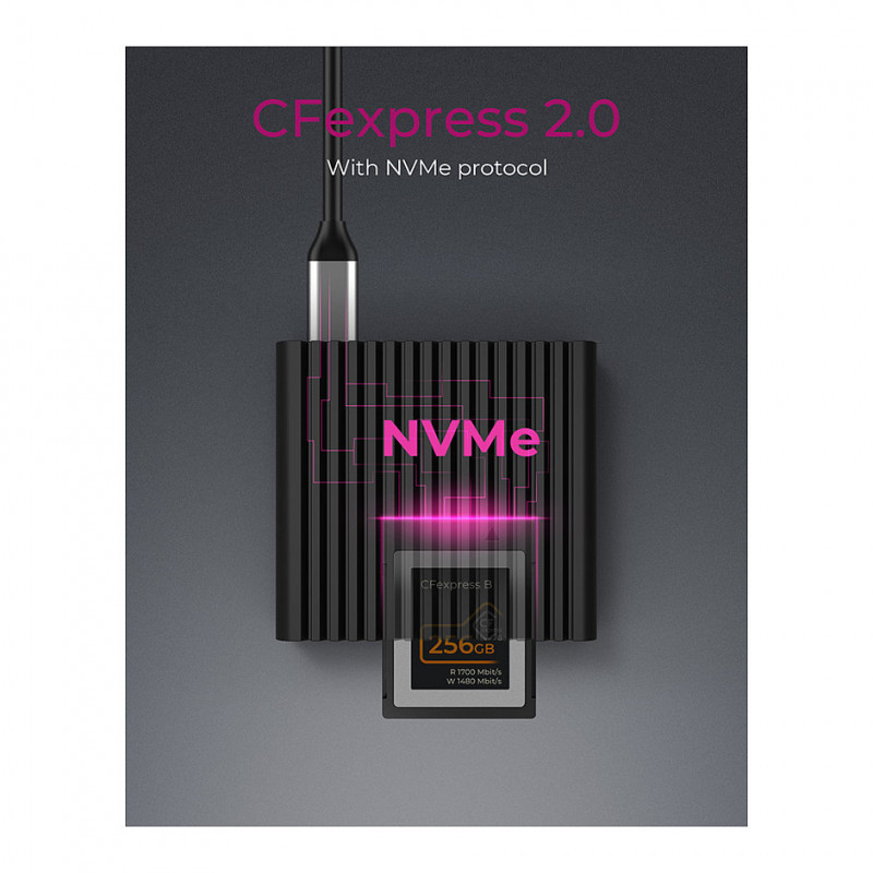A good mixture for the highest expectations: with USB 3.2 (Gen 2), data transfer rates of up to 10 Gbit/s are achieved. Together with the NVMe protocol of the CFexpress Type-B memory cards, this results in a highly performant combination. Copy your files at 1 GB per second!