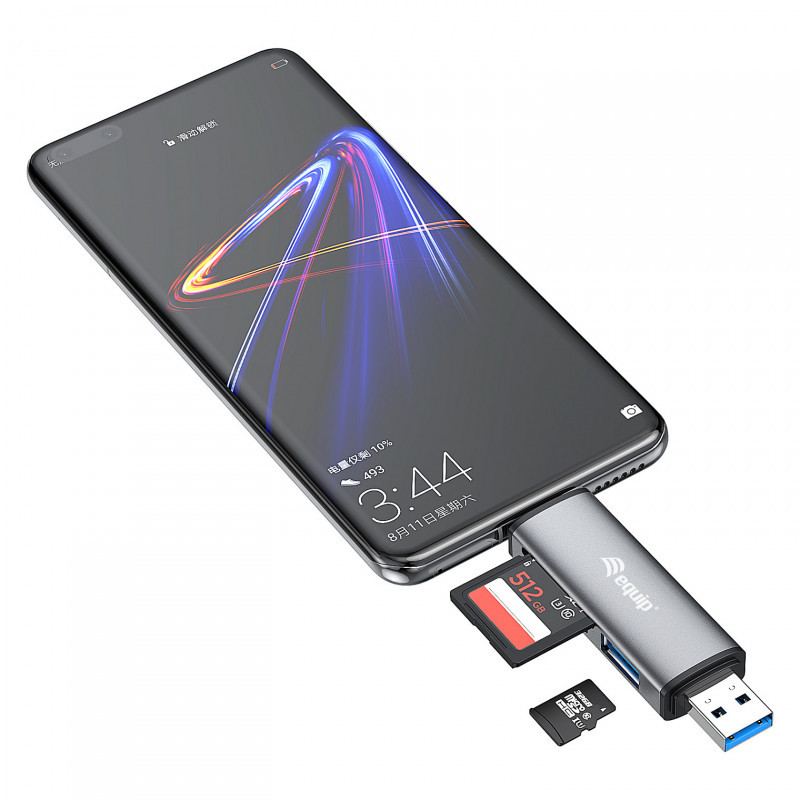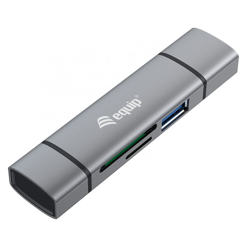 "Equip Card Reader with USB 3.0 Hub, OTG. Compatible memory cards: MicroSD (TransFlash), MicroSDHC, SD, SDHC, Product colour: Grey, Certification: CE & RoHS. Interface: USB 3.2 Gen 1 (3.1 Gen 1) Type-A/Type-C. Width: 202 mm, Depth: 12 mm, Height: 86.2 mm. Quantity per pack: 1 pc(s), Package width: 74 mm, Package depth: 21 mm. Windows operating systems supported: Windows 10, Windows 7, Windows 8, Mac operating systems supported: Mac OS X 10.10 Yosemite, Mac OS X 10.11 El Capitan, Mac OS X 10.12 Sierra, Mac OS X 10.13 High..., Mobile operating systems supported: Android, iOS"\n"The equip 245460 Card Reader with an integrated USB hub (OTG) can either be connected to your smartphone, tablet or notebook. This allows you to access inserted storage media such as USB sticks, SD or MicroSD memory cards. You can connect the device via the hub’s USB A (USB 3.0) or the USB-C™ plug.
