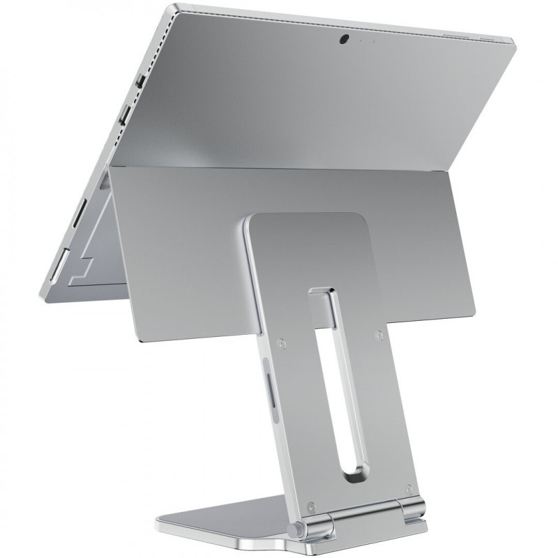 "Kensington Elevated Stand for Surface. Product colour: Platinum, Material: Aluminium, Rubber, Thermoplastic polyurethane (TPU), Zinc. Width: 126.4 mm, Depth: 139.3 mm, Height: 193 mm. Package width: 146 mm, Package depth: 230 mm, Package height: 27 mm. Master (outer) case width: 125 mm, Master (outer) case length: 240 mm, Master (outer) case height: 175 mm. Compatibility: Surface Pro 13”; Surface Pro 7+; Surface Pro 9; Surface Pro 12""; Surface Go 4; Surface Pro 10;..."\n"Designed exclusively for Surface in collaboration with Microsoft, the Elevated Stand for Surface is a sleek and compact accessory for your Surface Pro or Surface Go that effortlessly enhances comfort, security and productivity. This innovative all-in-one riser elevates the Surface to eye level to support ergo-friendly workstations with external keyboards and reduce neck, back and shoulder strain. Tilt and flip options accommodate optimum viewing angles. The stand includes additional thoughtful features such as a magnetic storage location for a Surflink™ connector and a cable management channel. Includes professional support and a two-year limited warranty."