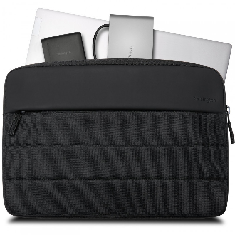 "Kensington EQ 14"" Laptop Sleeve. Case type: Sleeve case, Maximum screen size: 35.6 cm (14""), Number of front pockets: 1. Weight: 190 g. Surface coloration: Monochromatic"\n"8.1 x 250ml plastic bottles were transformed into PET polyester yarn to create the EQ 14 Laptop Sleeve - an affordable value-for-money sleeve designed to protect laptops and tablets from scratches, bumps and drops. Made of 58% post-consumer recycled (PCR) polyester, it accommodates up to 14” devices. The sleeve includes an exterior pocket to store and protect peripherals. Easily fits into Kensington EQ Laptop Backpacks and Laptop Carrying Cases. Includes a 2-year limited warranty."