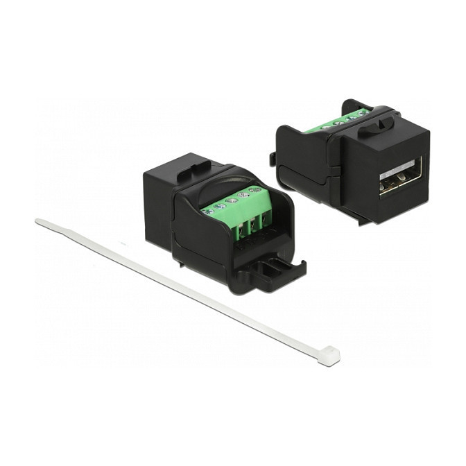 "DeLOCK 86386. Construction type: Flat, Product colour: Black, Connector 1: USB A. Width: 20 mm, Depth: 36 mm, Height: 22 mm. Quantity per pack: 1 pc(s)"\n"This module by Delock can be used to extend a USB connection. The terminal block can be connected to e. g. a pre-installed network cable.