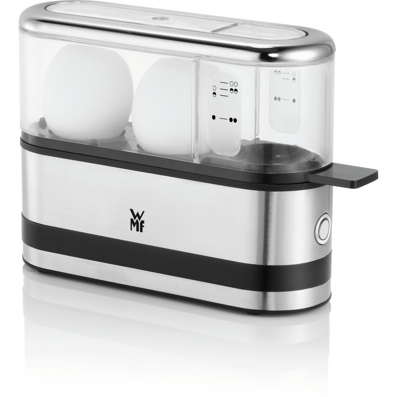 "WMF KITCHENminis 0415020011. Eggs capacity: 2 egg(s), Housing material: Stainless steel, Control type: Button. Power: 250 W, AC input voltage: 220-240 V, AC input frequency: 50 - 60 Hz. Width: 198 mm, Depth: 60 mm, Height: 132 mm"\n