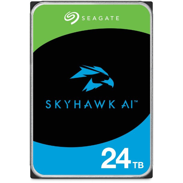 "Seagate SkyHawk AI. HDD capacity: 24 TB, HDD speed: 7200 RPM, Storage drive buffer size: 512 MB, HDD size: 3.5"", Interface: Serial ATA III"\n"A video-optimised drive, SkyHawk AI is designed for NVRs with artificial intelligence for edge applications.