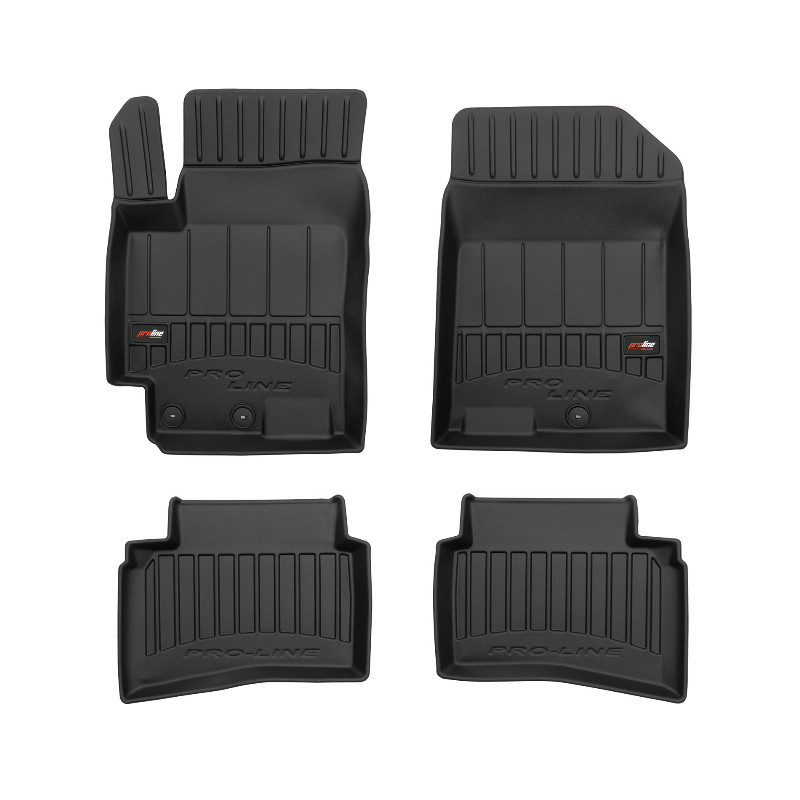 Guminiai ProLine 3D kilimėliai: (aukštos kokybės plastiko, gumos mišinys / TPE, komplektas - 4vnt., juodi, krašto aukštis 7 cm, montavimo būdas - spaustukai). AUTOMOBILIŲ KILIMĖLIAI FROGUM 3D PROLINE LUXURY • Dėl naujoviškos 3D skenavimo technologijos atitinka idealiai; • Kraštai papildomai apsaugoti – aukštis 7 cm, visada švarus automobilis; • Itin patvari medžiaga su unikalia neslystančia struktūra, atspari nešvarumams. • Išskirtinis stabilumas dėl spaustukų – lengvai montuojama spustelėjus; • Pakojo zonos apsauga – komfortas, leidžiantis nuleisti vairuotojo koją; 3D ProLine aukštos kokybės guminiai kilimėliai padeda išlaikyti automobilį švarų. Modernus ir funkcionalus dizainas, ir ypač aukštas kraštas garantuoja efektyvų vandens ir purvo surinkimą ir neleidžia jiems išbėgti. Taip automobilio salonas išlieka švarus. Pagaminti iš aukštos kokybės gumos, kurioje nėra toksiškų komponentų. Bekvapis. Kilimėliai idealiai atitinka ir puikiai priglunda prie salono grindų. Guminiai kilimėliai išlaiko savo elastingumą net esant temperatūros pokyčiams. Specialus paviršius neleidžia kilimėliams slysti vairuojant, o tai daro didelę įtaką saugumui ir kelionės patogumui