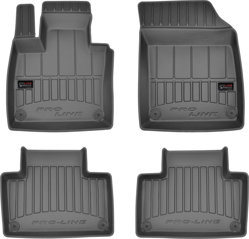 Guminiai ProLine 3D kilimėliai: (aukštos kokybės plastiko, gumos mišinys / TPE, komplektas - 3vnt., juodi, krašto aukštis 7 cm, montavimo būdas - spaustukai). AUTOMOBILIŲ KILIMĖLIAI FROGUM 3D PROLINE LUXURY • Dėl naujoviškos 3D skenavimo technologijos atitinka idealiai; • Kraštai papildomai apsaugoti – aukštis 7 cm, visada švarus automobilis; • Itin patvari medžiaga su unikalia neslystančia struktūra, atspari nešvarumams. • Išskirtinis stabilumas dėl spaustukų – lengvai montuojama spustelėjus; • Pakojo zonos apsauga – komfortas, leidžiantis nuleisti vairuotojo koją; 3D ProLine aukštos kokybės guminiai kilimėliai padeda išlaikyti automobilį švarų. Modernus ir funkcionalus dizainas, ir ypač aukštas kraštas garantuoja efektyvų vandens ir purvo surinkimą ir neleidžia jiems išbėgti. Taip automobilio salonas išlieka švarus. Pagaminti iš aukštos kokybės gumos, kurioje nėra toksiškų komponentų. Bekvapis. Kilimėliai idealiai atitinka ir puikiai priglunda prie salono grindų. Guminiai kilimėliai išlaiko savo elastingumą net esant temperatūros pokyčiams. Specialus paviršius neleidžia kilimėliams slysti vairuojant, o tai daro didelę įtaką saugumui ir kelionės patogumui