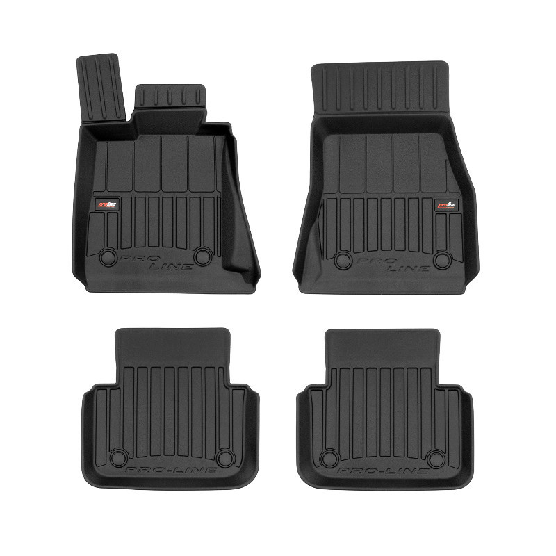 Guminiai ProLine 3D kilimėliai: (aukštos kokybės plastiko, gumos mišinys / TPE, komplektas - 4vnt., juodi, krašto aukštis 7 cm, montavimo būdas - spaustukai). AUTOMOBILIŲ KILIMĖLIAI FROGUM 3D PROLINE LUXURY • Dėl naujoviškos 3D skenavimo technologijos atitinka idealiai; • Kraštai papildomai apsaugoti – aukštis 7 cm, visada švarus automobilis; • Itin patvari medžiaga su unikalia neslystančia struktūra, atspari nešvarumams. • Išskirtinis stabilumas dėl spaustukų – lengvai montuojama spustelėjus; • Pakojo zonos apsauga – komfortas, leidžiantis nuleisti vairuotojo koją; 3D ProLine aukštos kokybės guminiai kilimėliai padeda išlaikyti automobilį švarų. Modernus ir funkcionalus dizainas, ir ypač aukštas kraštas garantuoja efektyvų vandens ir purvo surinkimą ir neleidžia jiems išbėgti. Taip automobilio salonas išlieka švarus. Pagaminti iš aukštos kokybės gumos, kurioje nėra toksiškų komponentų. Bekvapis. Kilimėliai idealiai atitinka ir puikiai priglunda prie salono grindų. Guminiai kilimėliai išlaiko savo elastingumą net esant temperatūros pokyčiams. Specialus paviršius neleidžia kilimėliams slysti vairuojant, o tai daro didelę įtaką saugumui ir kelionės patogumui