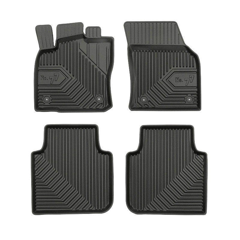 Guminiai Premium 77 kilimėliai: (aukštos kokybės plastiko, gumos mišinys / TPE, komplektas - 4vnt., juodi, krašto aukštis 4 cm, montavimo būdas - spaustukai). AUTOMOBILIŲ KILIMĖLIAI FROGUM 77 PREMIUM • Dėl naujoviškos 3D skenavimo technologijos atitinka idealiai; • Krašto aukštis - 4 cm suteikia didesnę apsaugą nuo nešvarumų • Modernus ir funkcionalus dizainas, išlaikantis nešvarumus kilimėlio viduje • Neslystantys spacialūs spaustukai, lengva montuoti; • Speciali apsauga, leidžianti nuleisti vairuotojo koją; Aukšto lygio apsauga jūsų automobiliui, kilimėliai idealiai atitinka ir puikiai priglunda prie salono grindų. Modernus ir funkcionalus dizainas, bei aukštas kraštas garantuoja efektyvų vandens ir purvo surinkimą ir neleidžia jam nutekėti. Taip automobilio salonas išlieka švarus. Pagaminti iš aukštos kokybės gumos, kurioje nėra toksiškų komponentų. Bekvapis. Kilimėliai turi spaustukus, todėl jį lengva pritvirtinti prie grindų. Guminiai kilimėliai išlaiko savo elastingumą net esant temperatūros pokyčiams. Specialus paviršius neleidžia kilimėliams slysti vairuojant, todėl labai paveikia saugumą ir kelionės komfortą.