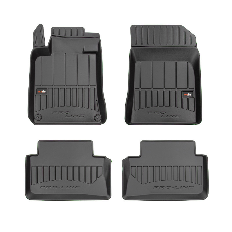 Guminiai ProLine 3D kilimėliai: (aukštos kokybės plastiko, gumos mišinys / TPE, komplektas - 3vnt., juodi, krašto aukštis 7 cm, montavimo būdas - spaustukai). AUTOMOBILIŲ KILIMĖLIAI FROGUM 3D PROLINE LUXURY • Dėl naujoviškos 3D skenavimo technologijos atitinka idealiai; • Kraštai papildomai apsaugoti – aukštis 7 cm, visada švarus automobilis; • Itin patvari medžiaga su unikalia neslystančia struktūra, atspari nešvarumams. • Išskirtinis stabilumas dėl spaustukų – lengvai montuojama spustelėjus; • Pakojo zonos apsauga – komfortas, leidžiantis nuleisti vairuotojo koją; 3D ProLine aukštos kokybės guminiai kilimėliai padeda išlaikyti automobilį švarų. Modernus ir funkcionalus dizainas, ir ypač aukštas kraštas garantuoja efektyvų vandens ir purvo surinkimą ir neleidžia jiems išbėgti. Taip automobilio salonas išlieka švarus. Pagaminti iš aukštos kokybės gumos, kurioje nėra toksiškų komponentų. Bekvapis. Kilimėliai idealiai atitinka ir puikiai priglunda prie salono grindų. Guminiai kilimėliai išlaiko savo elastingumą net esant temperatūros pokyčiams. Specialus paviršius neleidžia kilimėliams slysti vairuojant, o tai daro didelę įtaką saugumui ir kelionės patogumui