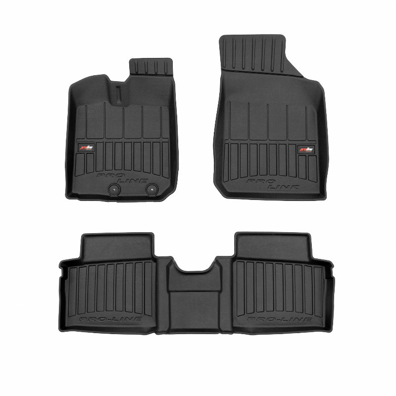 Guminiai ProLine 3D kilimėliai: (aukštos kokybės plastiko, gumos mišinys / TPE, komplektas - 4vnt., juodi, krašto aukštis 7 cm, montavimo būdas - spaustukai). AUTOMOBILIŲ KILIMĖLIAI FROGUM 3D PROLINE LUXURY • Dėl naujoviškos 3D skenavimo technologijos atitinka idealiai; • Kraštai papildomai apsaugoti – aukštis 7 cm, visada švarus automobilis; • Itin patvari medžiaga su unikalia neslystančia struktūra, atspari nešvarumams. • Išskirtinis stabilumas dėl spaustukų – lengvai montuojama spustelėjus; • Pakojo zonos apsauga – komfortas, leidžiantis nuleisti vairuotojo koją; 3D ProLine aukštos kokybės guminiai kilimėliai padeda išlaikyti automobilį švarų. Modernus ir funkcionalus dizainas, ir ypač aukštas kraštas garantuoja efektyvų vandens ir purvo surinkimą ir neleidžia jiems išbėgti. Taip automobilio salonas išlieka švarus. Pagaminti iš aukštos kokybės gumos, kurioje nėra toksiškų komponentų. Bekvapis. Kilimėliai idealiai atitinka ir puikiai priglunda prie salono grindų. Guminiai kilimėliai išlaiko savo elastingumą net esant temperatūros pokyčiams. Specialus paviršius neleidžia kilimėliams slysti vairuojant, o tai daro didelę įtaką saugumui ir kelionės patogumui