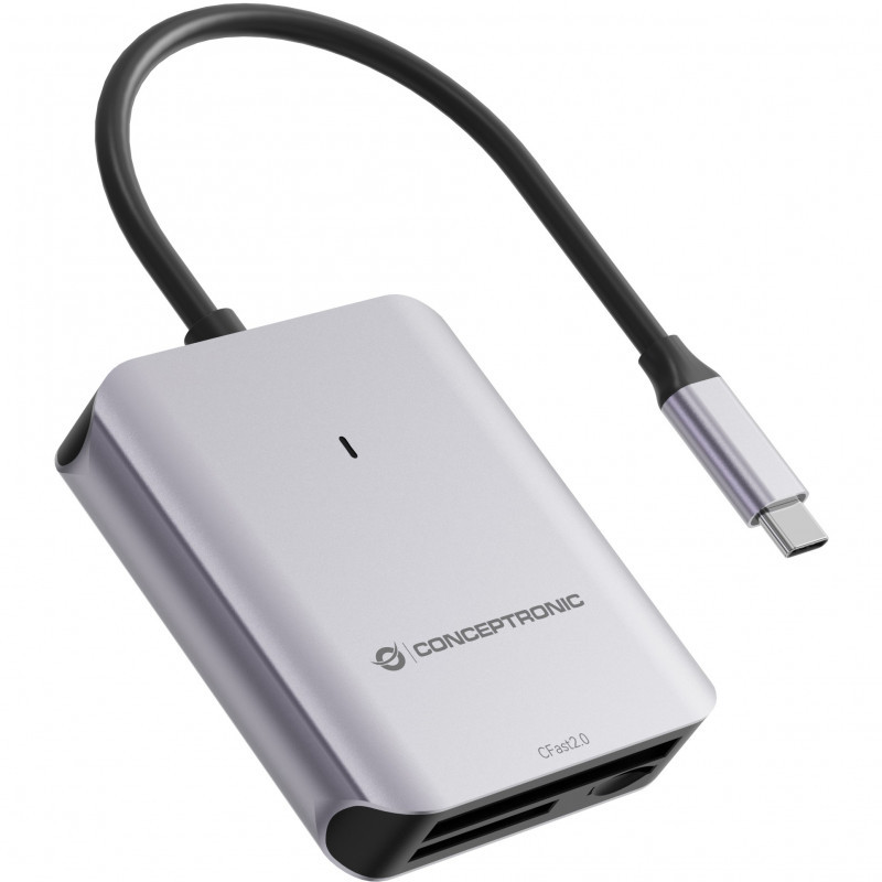 "Conceptronic BIAN09G 3-in-1 Card Reader USB 3.2 Gen 2, CFast 2.0, SD TF/MicroSD 4.0, UHS-II. Compatible memory cards: CFast 2.0, MicroSD (TransFlash), MicroSDHC, MicroSDXC, SD, SDHC, SDXC, Product colour: Grey, Data transfer rate: 10000 Mbit/s. Interface: USB 3.2 Gen 2 Type-C. Power source type: USB. Width: 64 mm, Depth: 73.2 mm, Height: 15 mm. Package width: 150 mm, Package depth: 108 mm, Package height: 120 mm"\n"This 3-in-1 Card Reader features a USB-C interface, providing seamless high-speed data transfer to any USB-C-compatible computer or device. With support for multiple card formats, including CFast 2.0, SD 4.0, and TF/MicroSD 4.0, it enables versatile and efficient handling of various media. Capable of transfer speeds up to 10Gbps, this reader ensures fast and reliable access to large files. An LED indicator provides a visual cue during data read and write operations.
