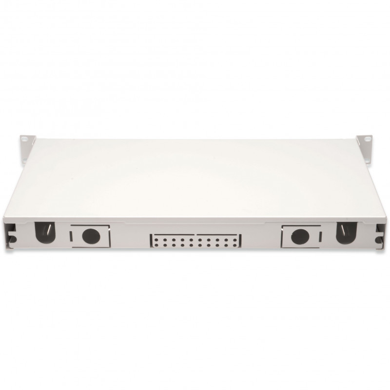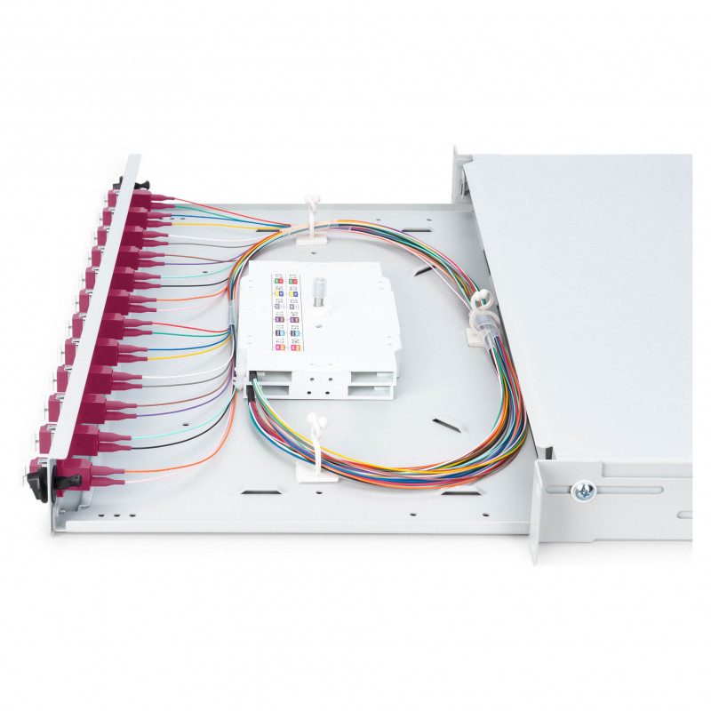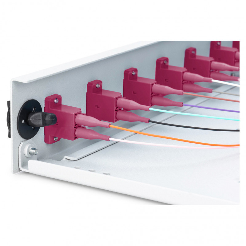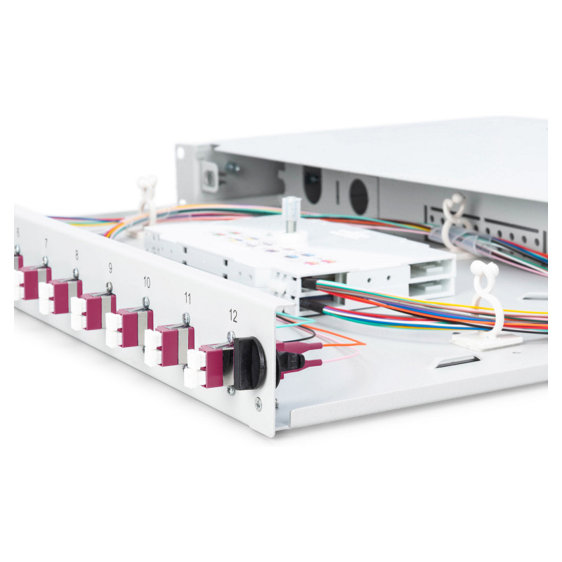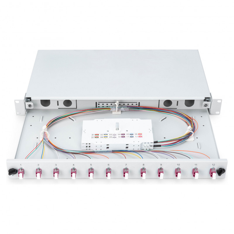 "Digitus Fiber Optic Sliding Splice Box, 1U, Equipped, LC, OM4. Type: Cable management panel, Housing material: Steel, Product colour: Grey. Quantity per pack: 1 pc(s)"\n"FO splice box, 1U, equipped, 12x LC DX, OM4,incl. splice cassette, colored pigtails, couplers"