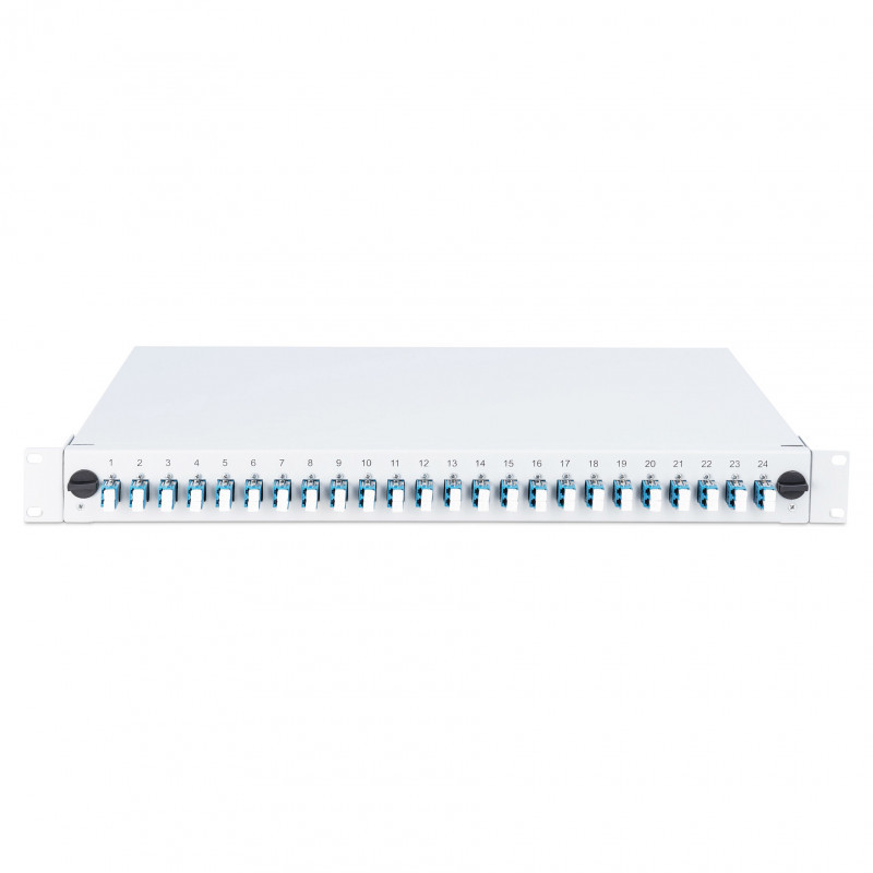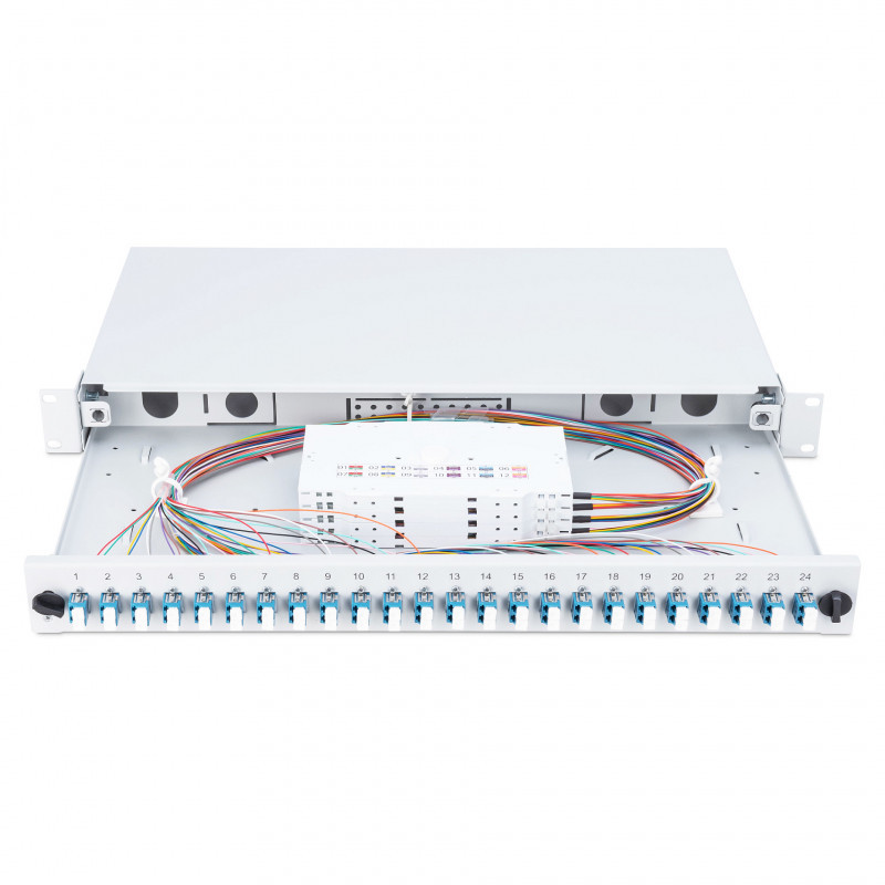 "Digitus Fiber Optic Sliding Splice Box, 1U, Equipped, LC, OM4. Type: Cable management panel, Housing material: Steel, Product colour: Grey. Quantity per pack: 1 pc(s)"\n"FO splice box, 1U, equipped, 24x LC DX, OM4,incl. splice cassette, colored pigtails, couplers"