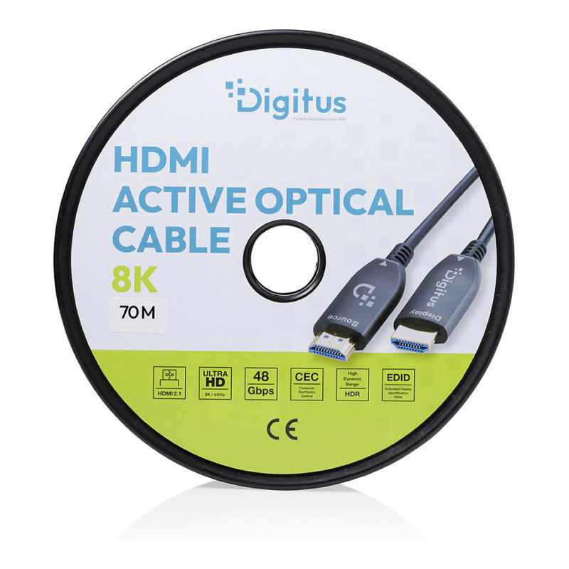 "Digitus HDMI AOC hybrid fiber optic cable, UHD 8K, 70 m. Cable length: 70 m, Connector 1: HDMI Type A (Standard), Connector 1 gender: Male, Connector 2: HDMI Type A (Standard), Connector 2 gender: Male, Connector contacts plating: Gold, HDMI version: 2.1, 3D, Maximum resolution: 7680 x 4320 pixels, Data transfer rate: 48 Gbit/s, Product colour: Black"\n"Transmits uncompressed video and audio signals in 8K at 60 Hz (UHD-2) with a bandwidth of up to 48 Gbps losslessly and without latency