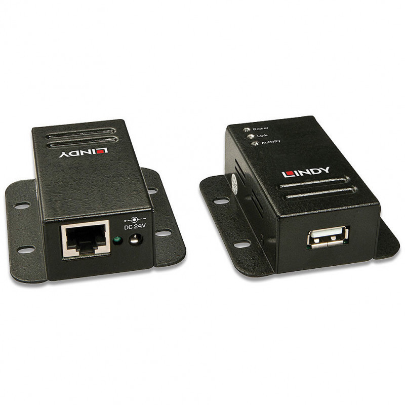 "Lindy 50m USB 2.0 Cat.6 Extender. Type: Network transmitter & receiver, Maximum transfer distance: 50 m, Data transfer rate: 480 Mbit/s. Product colour: Black, Housing material: Metal, Certification: CE, UKCA, FCC, RoHS, REACH. Input current: 0.25 A, Output voltage: 24 V, Output current: 0.5 A. Weight: 300 g, Transmitter width: 6 cm, Transmitter depth: 6.7 cm. Cables included: USB Type-A to USB Type-B"\n"The Lindy USB 2.0 Cat.6 Extender can be used to extend the distance between a USB peripheral device and the host computer by up to 50m.