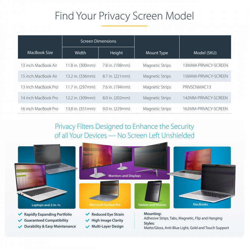"StarTech.com 15-inch MacBook Air 2023 Laptop Privacy Screen, Removable and Reversible Anti-Glare Privacy Filter, Magnetic Laptop Screen Protector w/ 51% Blue Light Reduction. Maximum screen size: 38.1 cm (15""), Suitable for: Laptop, Type: Frameless display privacy filter. Surface finish: Glossy / Matt, Protection features: Scratch resistant, Light transmission: 60%, Limits viewing angle: 30°. Weight: 50 g"\n"Prevent visual eavesdropping by limiting the viewing angles of your 15in MacBook Air 2023 & 2024 screen