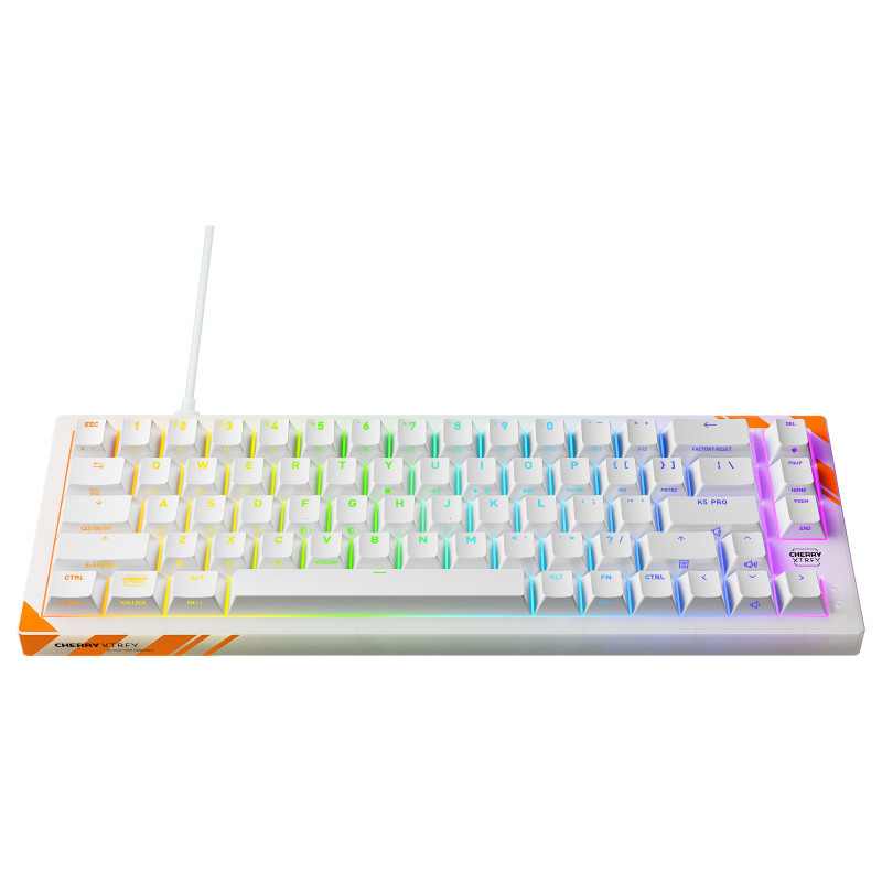 "CHERRY K5 PRO TMR COMPACT. Keyboard form factor: 65%. Keyboard style: Straight. Connectivity technology: Wired, Device interface: USB, Keyboard key switch: Mechanical, Keyboard layout: QWERTY. Backlight type: RGB LED. Cable length: 2 m. Recommended usage: Gaming. Product colour: Orange, White"\n"K5 PRO TMR.
