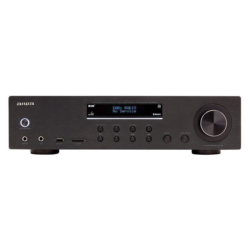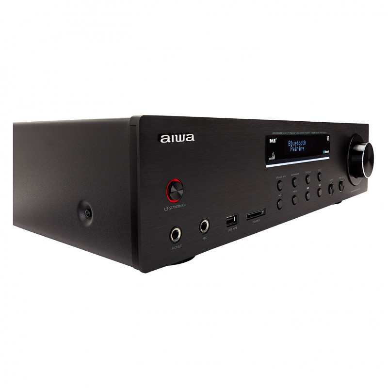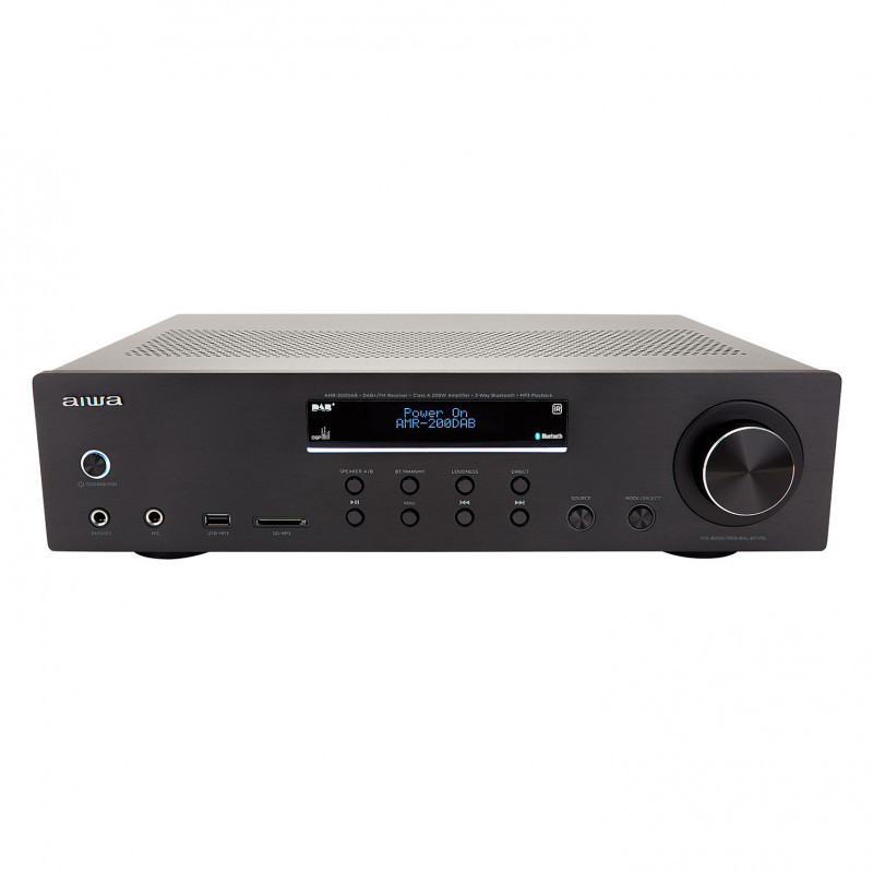 "Aiwa AMR-200DAB/BK. Audio output channels: 2.0 channels, Peak power per channel: 100 W, Total Harmonic Distortion (THD): 0.1%. Speakers connectivity type: RCA, Headphone connectivity: 6.3 mm, Speaker selector: A / B. Power source type: AC. Width: 290 mm, Depth: 100 mm, Height: 430 mm. Package weight: 9.12 kg"\n"The Aiwa AMR-200DAB/BK delivers 200W of powerful, clear sound (2x 100W RMS @4 Ohms, 0.1% THD). Key features include a phono input with RIAA EQ, Bluetooth v5.0, DAB+ and FM-RDS radio, and customizable sound settings. Enjoy versatile connectivity with multiple audio inputs and gold-plated speaker terminals. Perfect for audiophiles seeking superior audio quality."