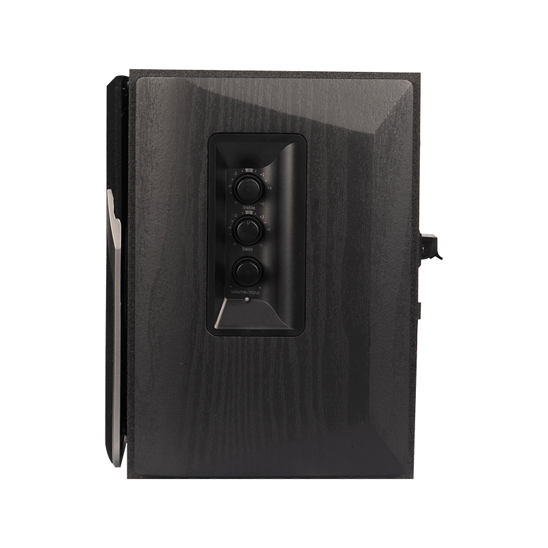 The right side panel features the bass, treble and volume controls. Of course, an IR remote control is also included; These speakers feature a TI PCM9211 digital decoding chip that accurately reproduces the source audio |