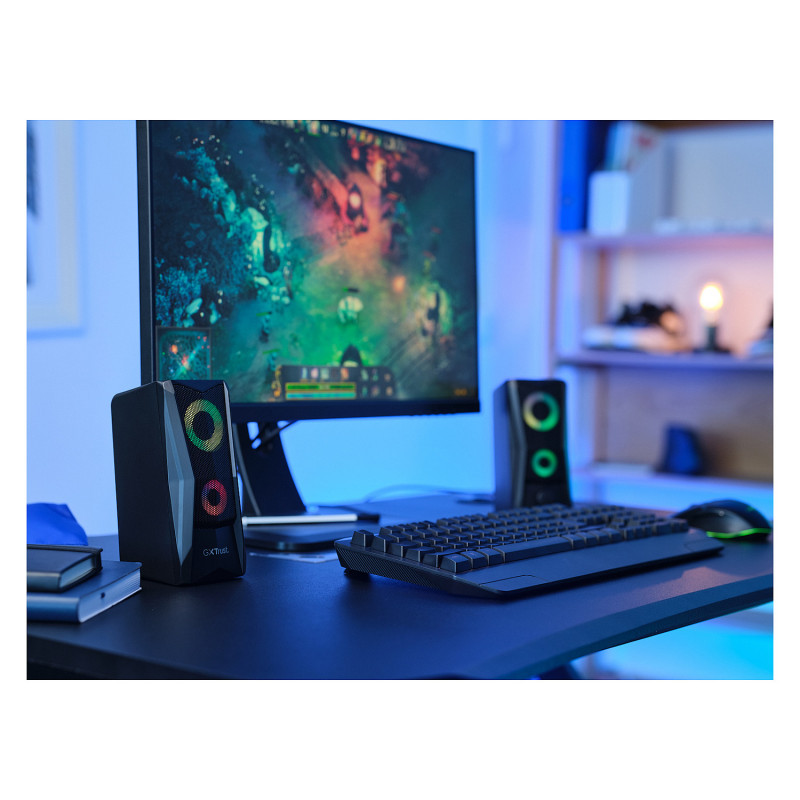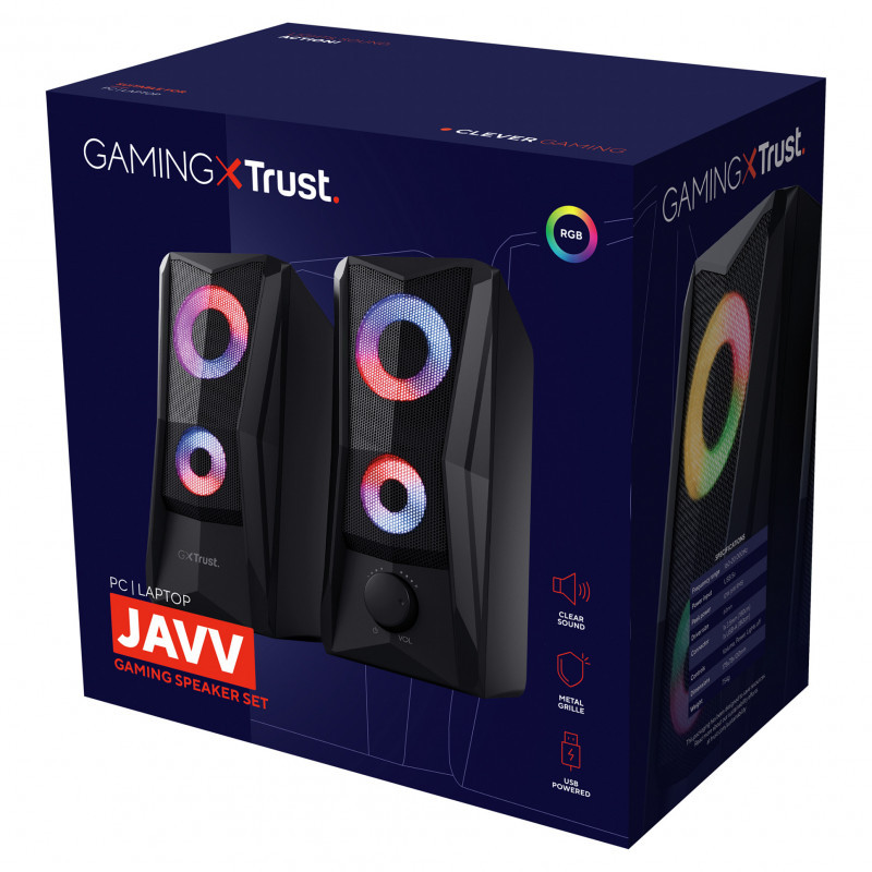 "Trust GXT 606 JAVV. Recommended usage: Universal. Audio output channels: 2.0 channels, Number of drivers: 2. Connectivity technology: Wired. RMS rated power: 12 W, Frequency range: 160 - 20000 Hz, Impedance: 4 Ω. Product colour: Black"\n"Small speaker, big sound