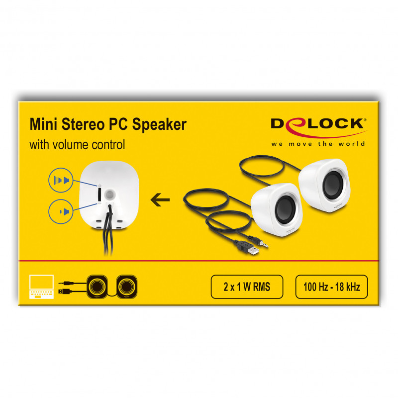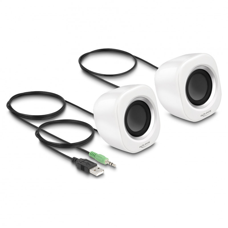 "DeLOCK Mini Stereo PC Speaker with 3.5 mm stereo jack male and USB powered. Recommended usage: PC. Audio output channels: 2.0 channels. Connectivity technology: Wired. RMS rated power: 2 W, Frequency range: 100 - 18000 Hz, Impedance: 4 Ω. Product colour: Silver, White"\n"This stereo speaker by Delock can be connected to a free 3.5 mm stereo jack female port to listen to music, for example.