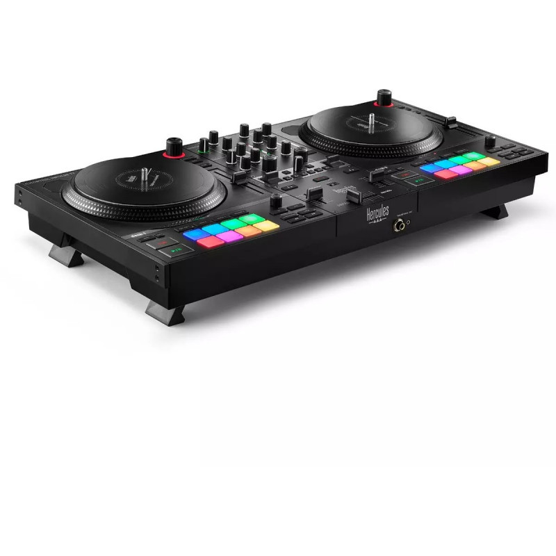 Experience the thrill of vinyl turntables with the Hercules DJControl Inpulse T7 motorized DJ controller. The modern take on a classic tool emphasizes the genuine feeling of vinyl discs, giving you a taste of the past with all the benefits of digital technology. Aspiring DJs, take your first steps towards spinning on vinyl with authentic turntable materials, for authentic DJ moves.