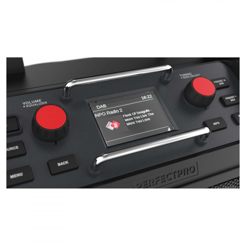 "Perfectpro Rockpro. Radio type: Worksite, Tuner type: Digital, Supported radio bands: DAB+, FM. RMS rated power: 30 W. Driver unit: 7.62 cm. Product colour: Black, Red, Material: Acrylonitrile butadiene styrene (ABS), Metal, Volume control: Rotary. Battery technology: Lithium-Ion (Li-Ion), Battery capacity: 4000 mAh, Battery life (max): 12 h"\n
