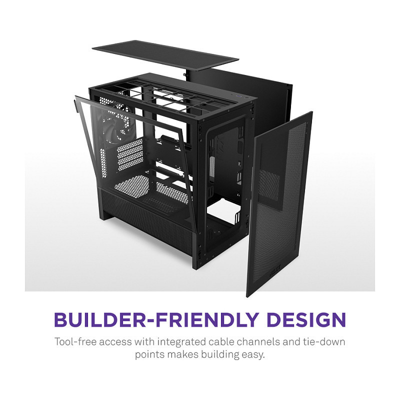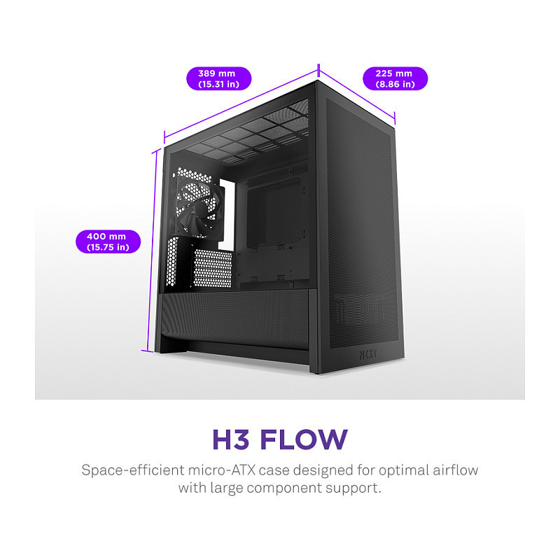 "NZXT H9 H3 Flow. Form factor: Midi Tower, Type: PC, Product colour: Black. Front fans diameters supported: 120,140 mm, Rear fans installed: 1x 120 mm, Rear fans diameters supported: 120 mm. Supported HDD sizes: 2.5,3.5"". Width: 225 mm, Depth: 389 mm, Height: 400 mm"\n"Space-Saving Design