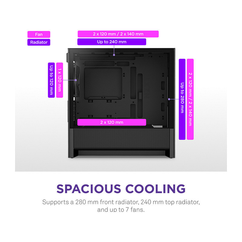 Supports a 280 mm front radiator and a 240 mm top radiator for versatile cooling setups.