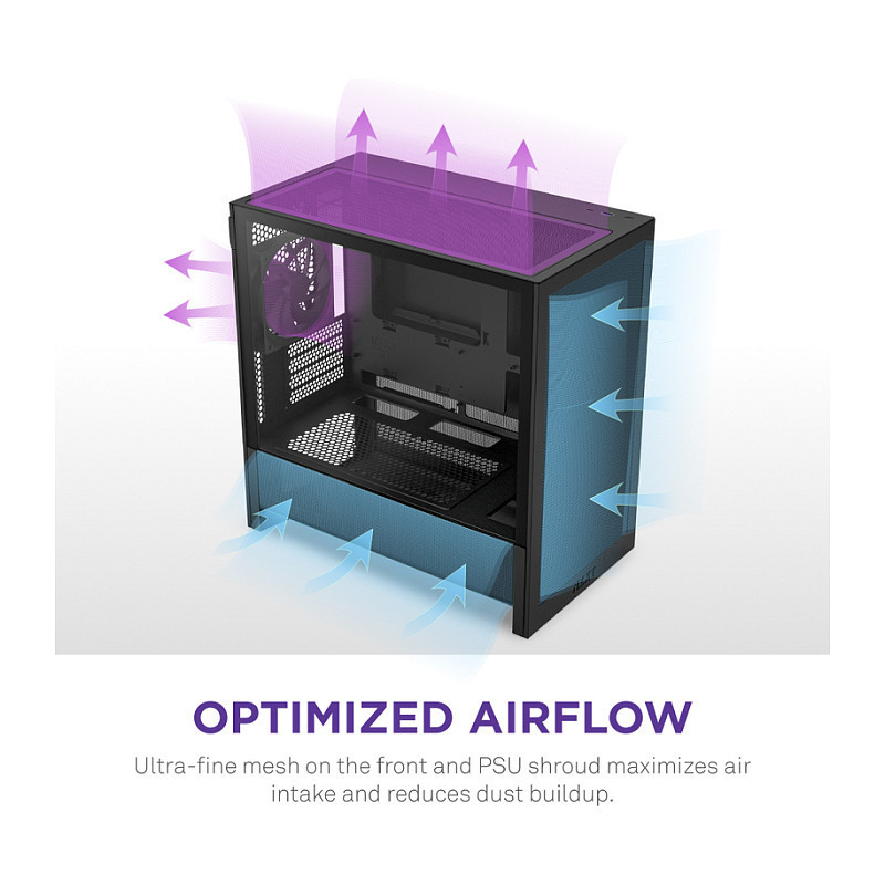 Ultra-fine mesh on the front, top, and sides enhances cooling while filtering dust. The ventilated PSU shroud optimizes intake from bottom-mounted fans.