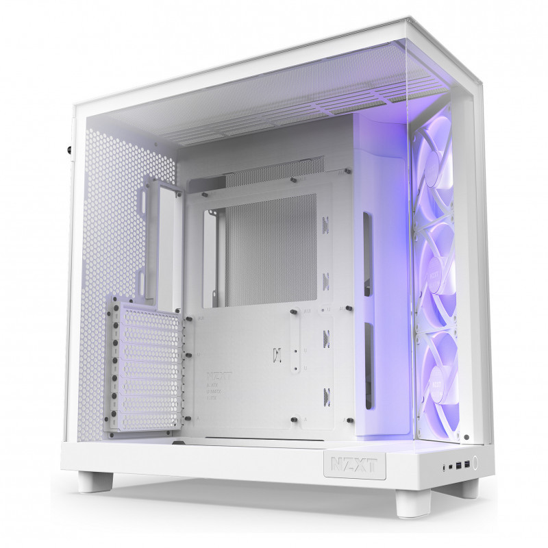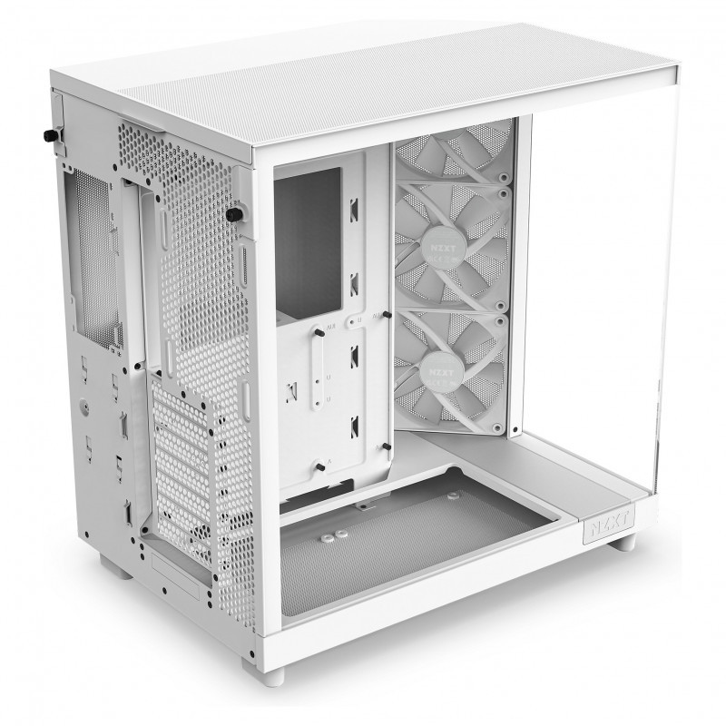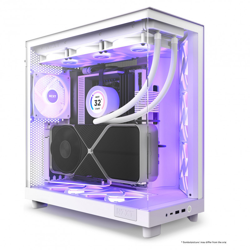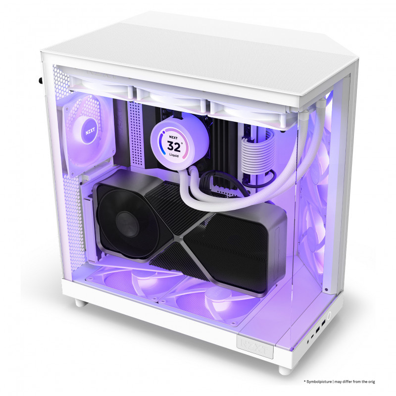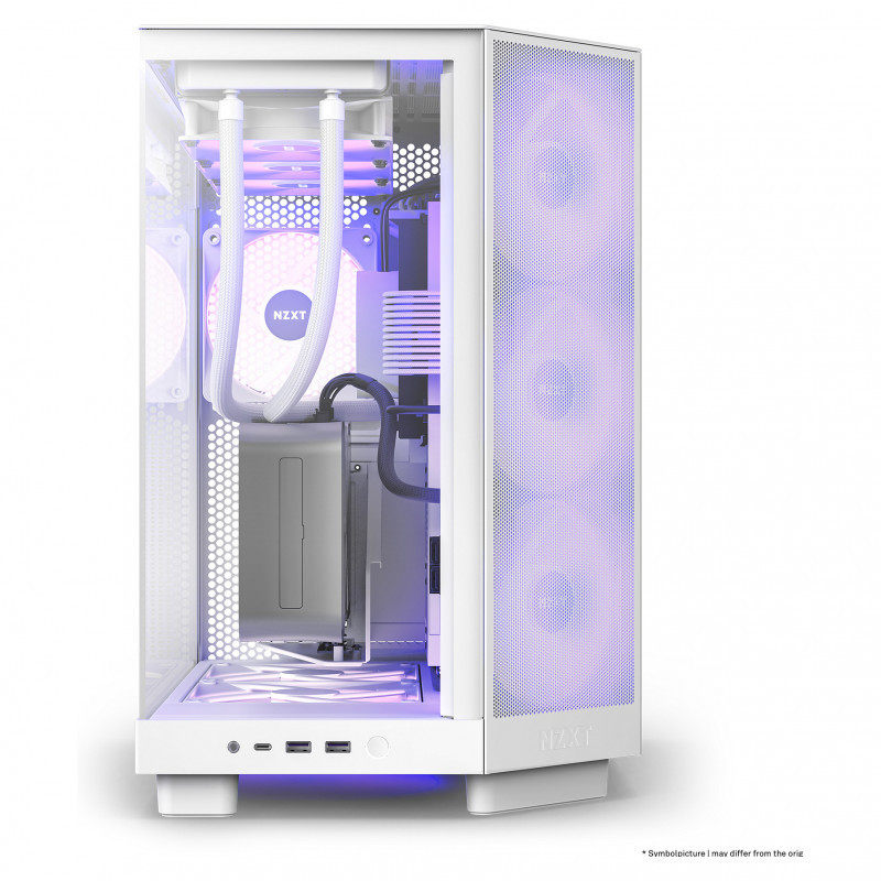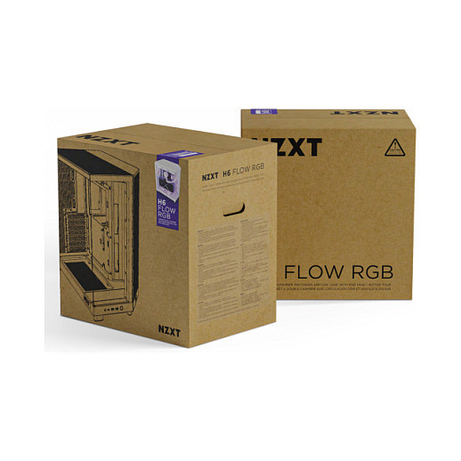 "NZXT H6 Flow RGB. Form factor: Midi Tower, Type: PC, Product colour: White. Front fans installed: 3x 120 mm, Front fans diameters supported: 120 mm, Rear fans diameters supported: 120 mm. Supported HDD sizes: 2.5,3.5"". Width: 287 mm, Depth: 415 mm, Height: 435 mm. Package width: 508 mm, Package depth: 361 mm, Package height: 515 mm"\n"Experience performance with a fresh perspective. The H6 Flow's innovative compact design emphasizes GPU cooling with a strategically angled front corner, so the fans direct air where it's most needed. The panoramic glass proudly showcases the interior, while the dual-chamber layout frees up space for a cleaner look and better cooling performance