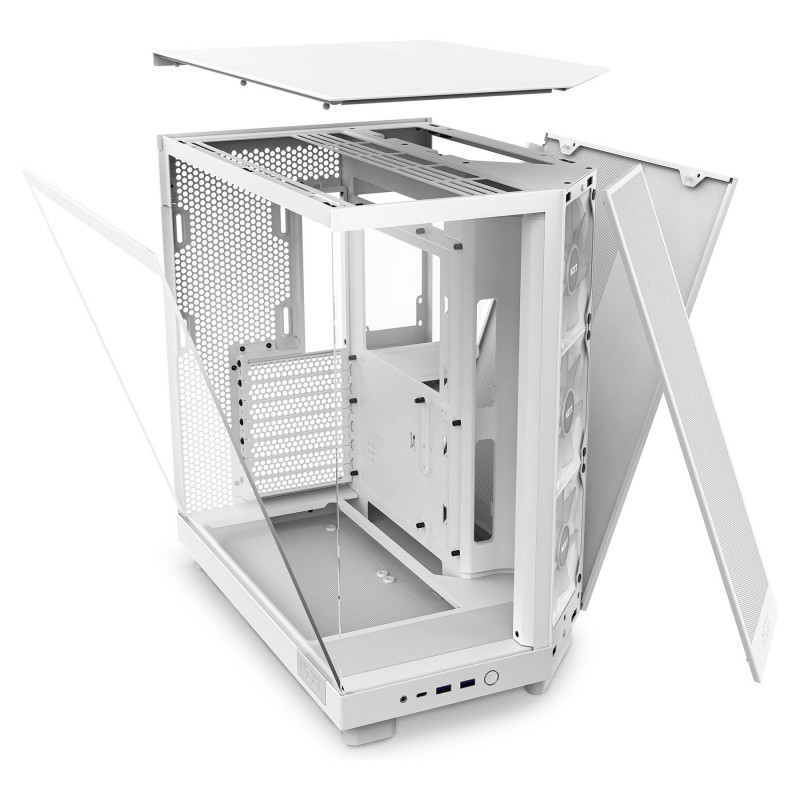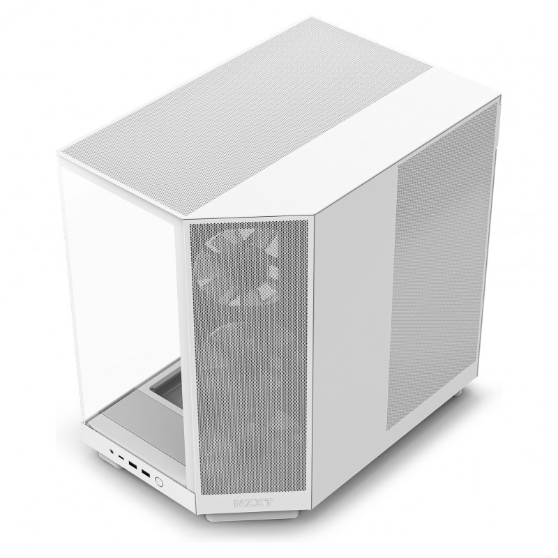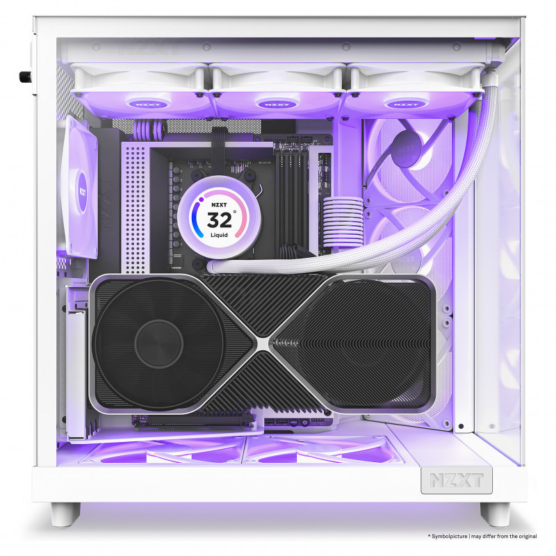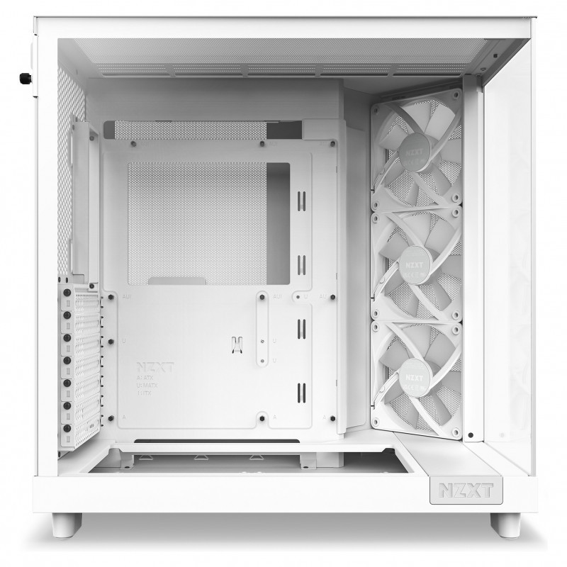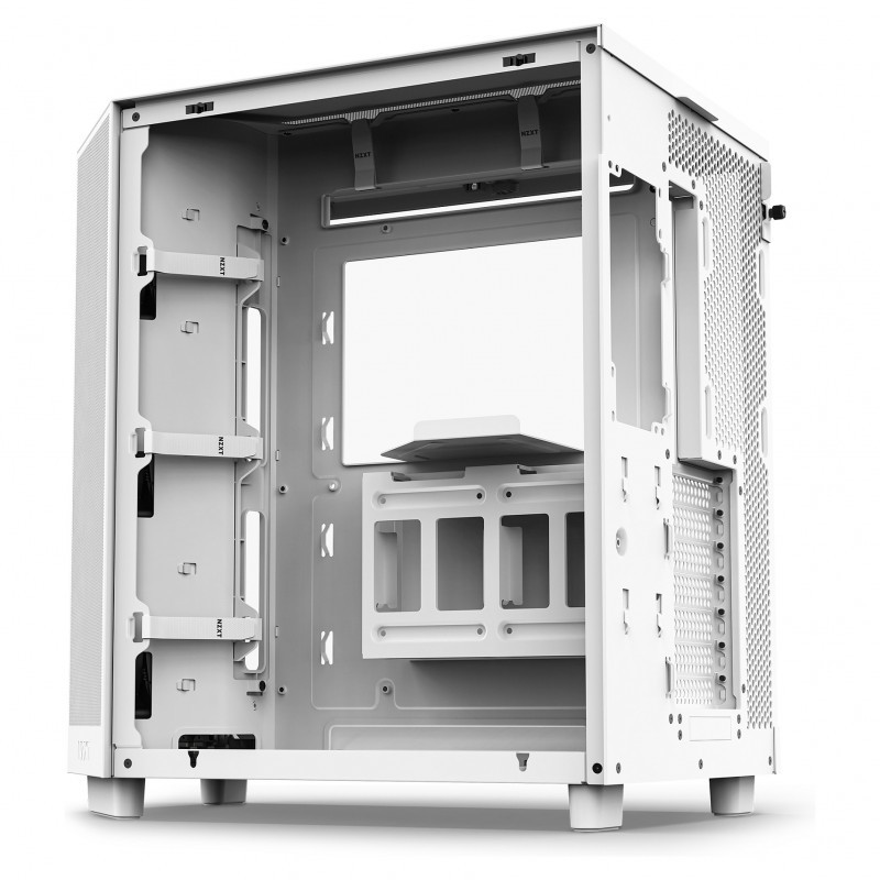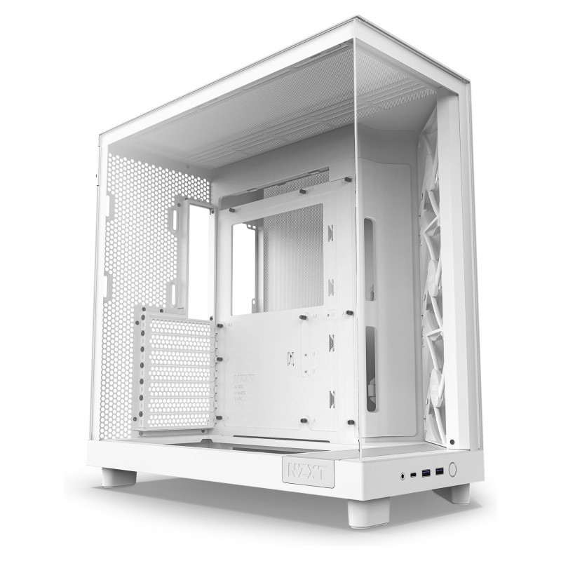 "NZXT H6 Flow RGB. Form factor: Midi Tower, Type: PC, Product colour: White. Front fans installed: 3x 120 mm, Front fans diameters supported: 120 mm, Rear fans diameters supported: 120 mm. Supported HDD sizes: 2.5,3.5"". Width: 287 mm, Depth: 415 mm, Height: 435 mm. Package width: 508 mm, Package depth: 361 mm, Package height: 515 mm"\n"Experience performance with a fresh perspective. The H6 Flow's innovative compact design emphasizes GPU cooling with a strategically angled front corner, so the fans direct air where it's most needed. The panoramic glass proudly showcases the interior, while the dual-chamber layout frees up space for a cleaner look and better cooling performance