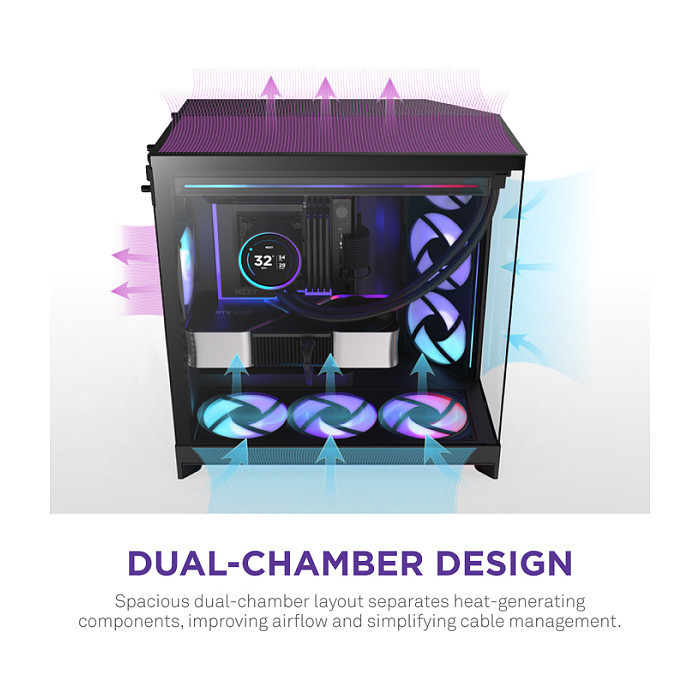 "NZXT H9 Flow RGB+. Form factor: Midi Tower, Type: PC, Product colour: Black. Front fans diameters supported: 120,140 mm, Rear fans installed: 1x 120 mm, Rear fans diameters supported: 120 mm. Supported HDD sizes: 2.5,3.5"". Width: 315 mm, Depth: 481 mm, Height: 506 mm"\n"Large Dual-Chamber Mid-Tower ATX Airflow Case with RGB and Control Hub