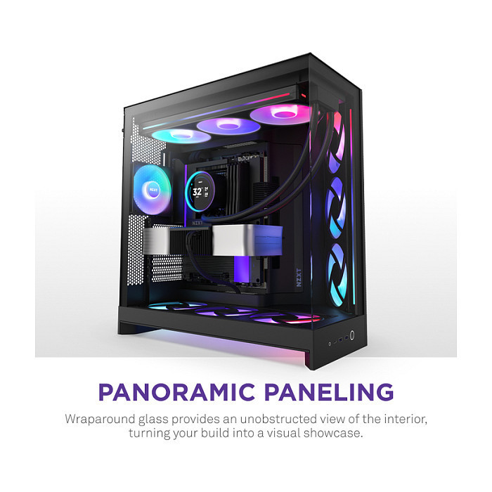 The H9 Flow is a spacious, dual-chamber case built for high-performance builds, featuring extensive cooling support and wraparound glass panels for an uninterrupted view of your build.