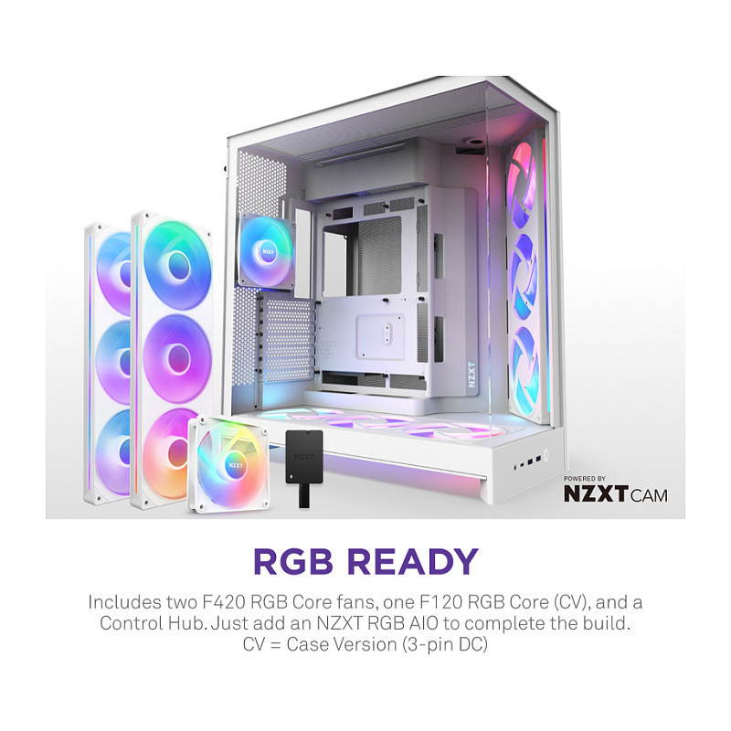 "NZXT H9 Flow RGB+. Form factor: Midi Tower, Type: PC, Product colour: White. Front fans installed: 3x 140 mm, Front fans diameters supported: 120,140 mm, Rear fans installed: 1x 120 mm. Supported HDD sizes: 2.5,3.5"". Width: 315 mm, Depth: 481 mm, Height: 506 mm"\n"Built to Flow. Made to Show.