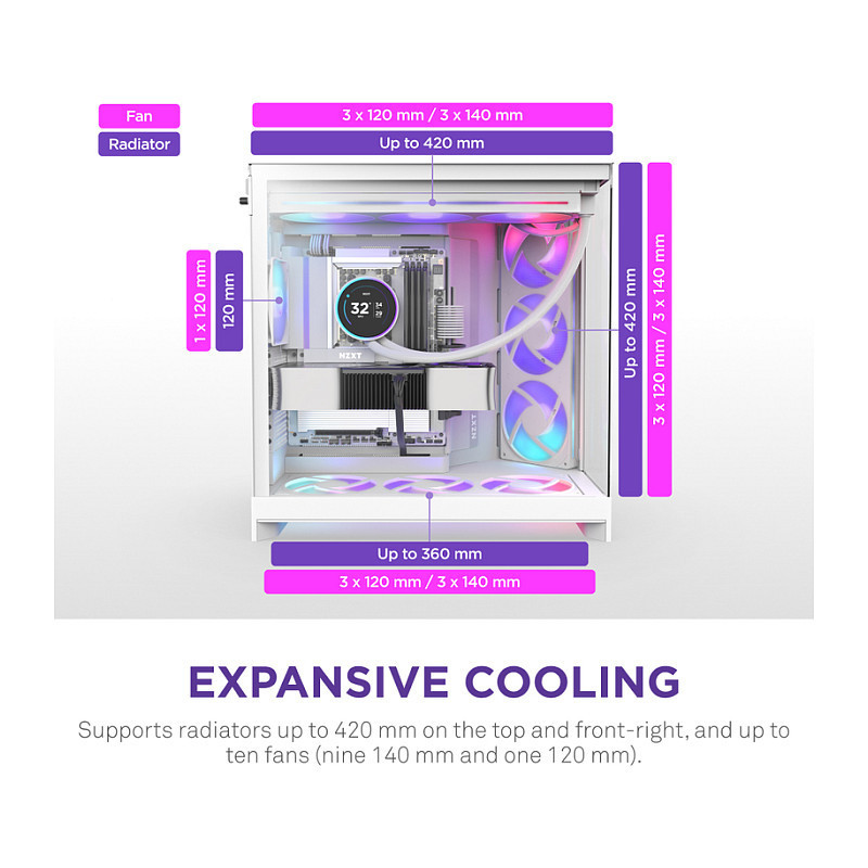 Holds up to 420 mm radiators on the top and front-right panels for versatile cooling.