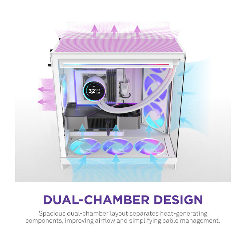 The H9 Flow is a spacious, dual-chamber case built for high-performance builds, featuring extensive cooling support and wraparound glass panels for an uninterrupted view of your build.