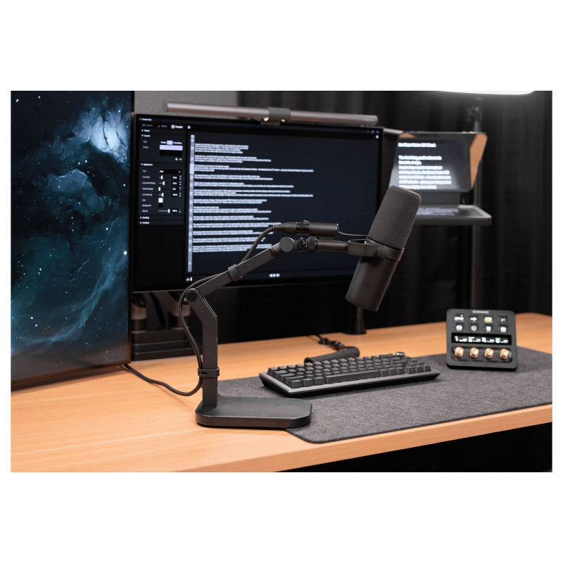 "Elgato Wave Desk Stand Studio Mounting Arm. Product type: Desktop microphone stand, Product colour: Black, Material: Metal. Weight: 1.88 kg, Maximum load weight: 1 kg. Packaging content: Wave Desk Stand, 4 cable ties, 1/4""-to-3/8"" and 1/4""-to-5/8"" adapters, Hex key, Quick Start Guide"\n"Compact and ultra-flexible, Wave Desk Stand helps you position your gear perfectly on any flat surface. Able to support up to 1 kg (2.2 lbs), it’s sturdy enough for heavy microphones, yet easy to move and adjust.