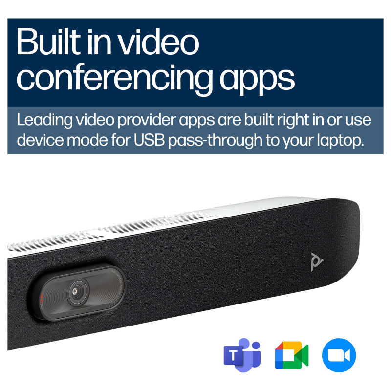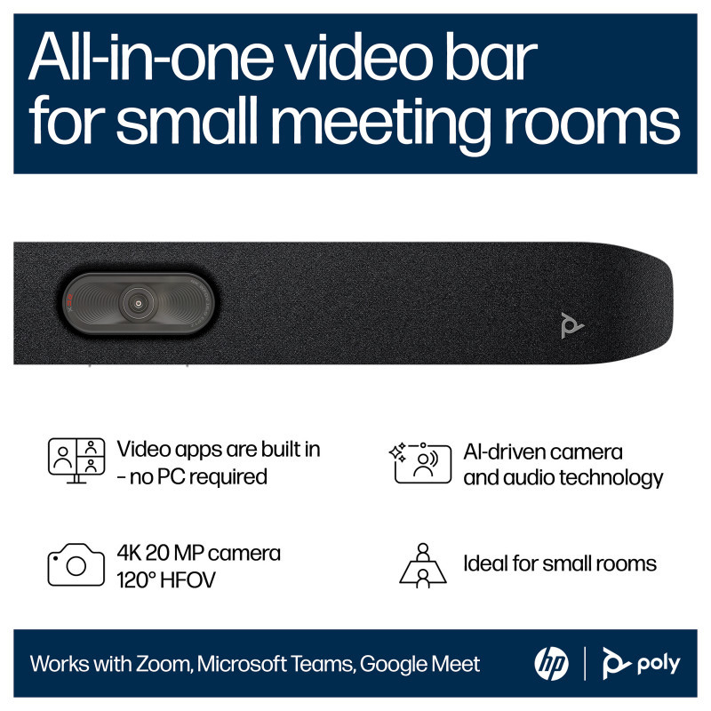 "HP Poly Studio X32 All-In-One Video Bar No Power Supply TAA. Number of persons: 5 person(s). Total megapixels: 20 MP, HD type: 4K Ultra HD, Supported video modes: 720p, 1080p, Maximum frame rate: 30 fps. Digital zoom: 5x. Ethernet LAN, Wi-Fi. Bluetooth, Product colour: Black"\n"Unleash big connections in small spaces