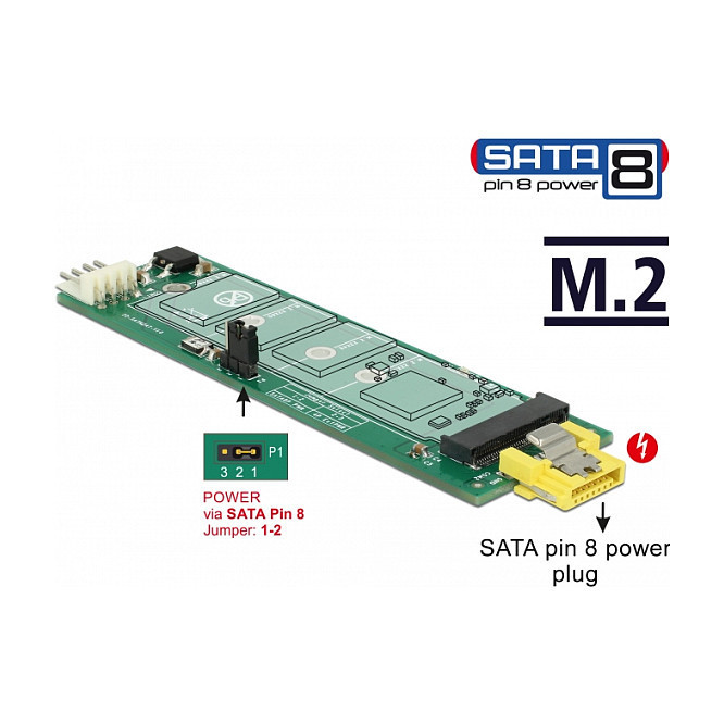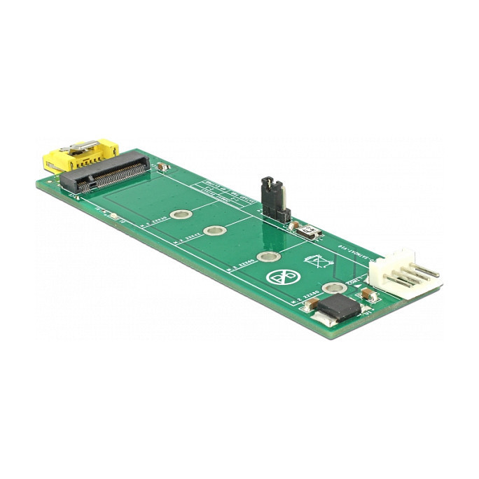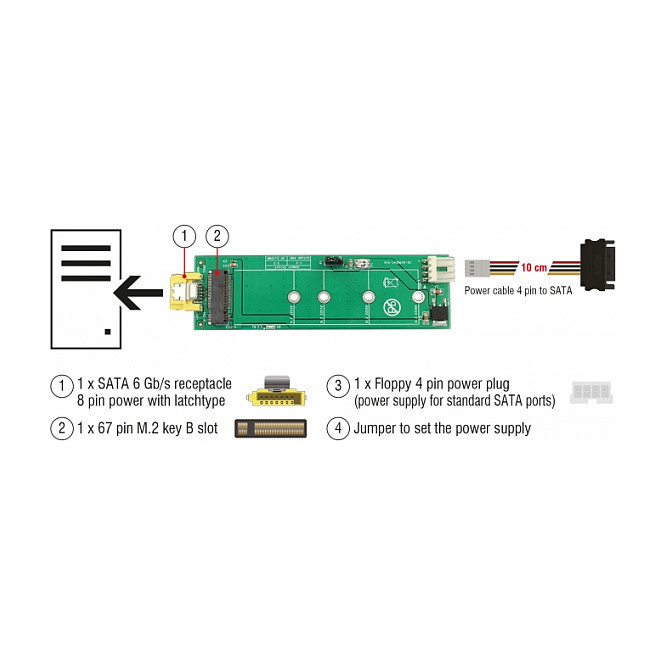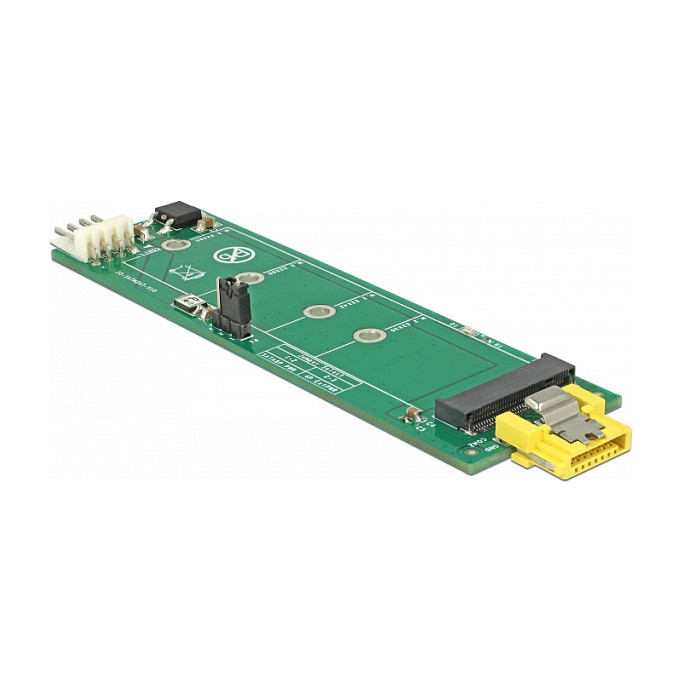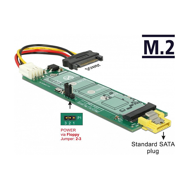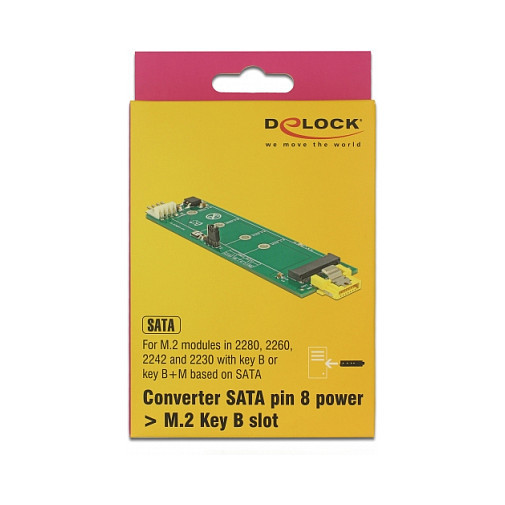 "DeLOCK 63917. Host interface: SATA, Output interface: M.2. LED indicators: Activity, Power. Data transfer rate (max): 6 Gbit/s. Windows operating systems supported: Windows 7, Windows 7 x64, Windows 8, Windows 8 x64, Windows 8.1, Windows 8.1 x64. Width: 30 mm, Depth: 114 mm, Height: 11 mm"\n"This converter by Delock enables the connection of a M.2 SSD in 2280, 2260, 2242 and 2230 format. The converter can be connected to a SATA pin 8 power plug and does not need an additional power supply. Additionally, the converter can be connected to a standard SATA port, then a power supply to the 4 pin power connector is needed."