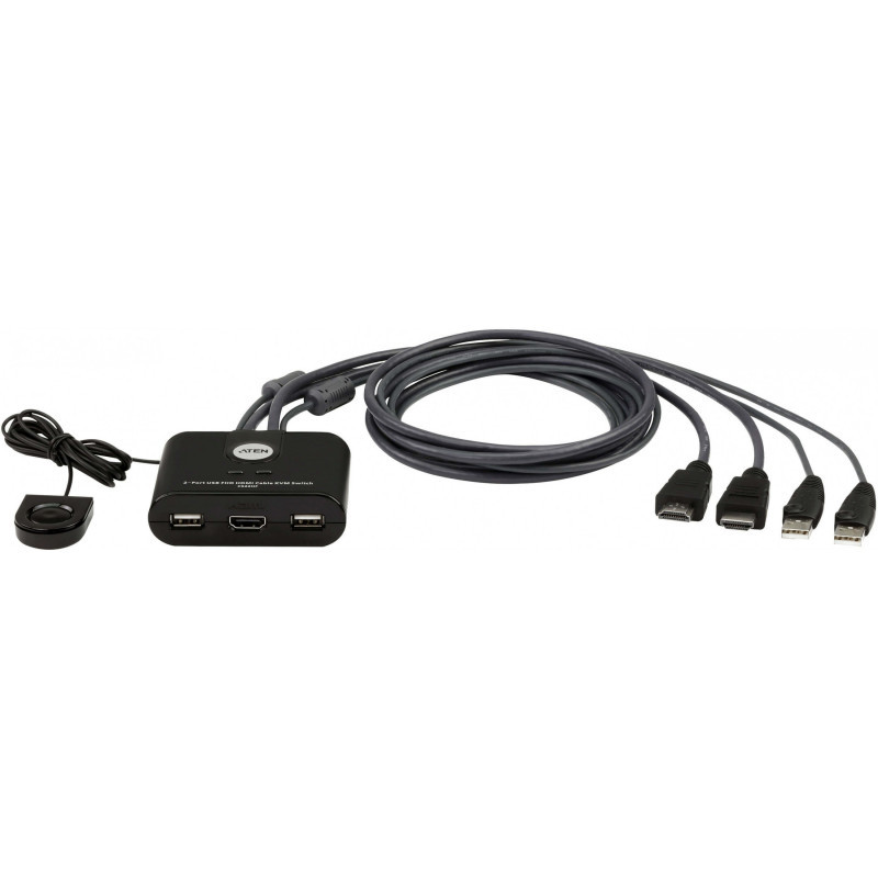 "ATEN CS22HF. Keyboard port type: USB, Mouse port type: USB, Video port type: HDMI. HD type: Full HD, Maximum resolution: 1920 x 1200 pixels, Video bandwidth: 60 Hz. Product colour: Black, Housing material: Plastic, Cable length: 1.2 m. Input voltage: 5 V, Power consumption (typical): 1.5 W. Width: 66.5 mm, Depth: 82.4 mm, Height: 25.2 mm"\n"Switching between two computers can be as easy as the push of a button. Refresh your workspace with the CS22HF by setting up a desktop console with one set of keyboard/mouse/display for control over two computers via USB and HDMI connections, and you’re all set. The compact CS22HF helps create an organized desktop with reduced cable clutter, and brings in FHD viewing quality to lift up work performance.