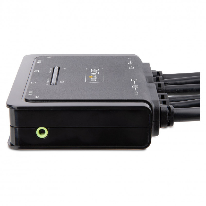 "StarTech.com 2-Port Dual-Monitor DisplayPort Cable KVM Switch, 4K 60Hz, Compact KVM with 5ft/1.5m USB-A/DisplayPort/Audio Integrated Cables, Bus Powered - Remote Push Button/Hotkey Switching. Keyboard port type: USB, Mouse port type: USB, Video port type: DisplayPort. HD type: 4K Ultra HD, Maximum resolution: 4096 x 2160 pixels, Video bandwidth: 60 Hz. Product colour: Black, Housing material: Acrylonitrile butadiene styrene (ABS), Cable length: 1.5 m. Power source: USB. Windows operating systems supported: Windows 10, Windows 10 Education, Windows 10 Education x64, Windows 10 Enterprise, Windows 10..., Mac operating systems supported: Mac OS X 10.12 Sierra, Mac OS X 10.13 High Sierra, Mac OS X 10.14 Mojave, Mac OS X 10.15 Catalina,..., Other operating systems supported: ChromeOS"\n"Share a mouse, keyboard, and dual 4K 60Hz DisplayPort displays between two DisplayPort enabled computers, using this KVM Switch with built-in cables