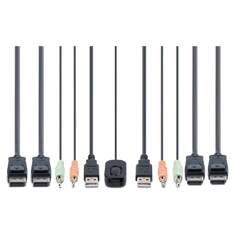 This Dual-Monitor KVM Switch enables users to switch between two USB-A and DisplayPort enabled desktops, sharing dual-4K 60Hz DisplayPort monitors, a keyboard and mouse, and audio input/output devices.