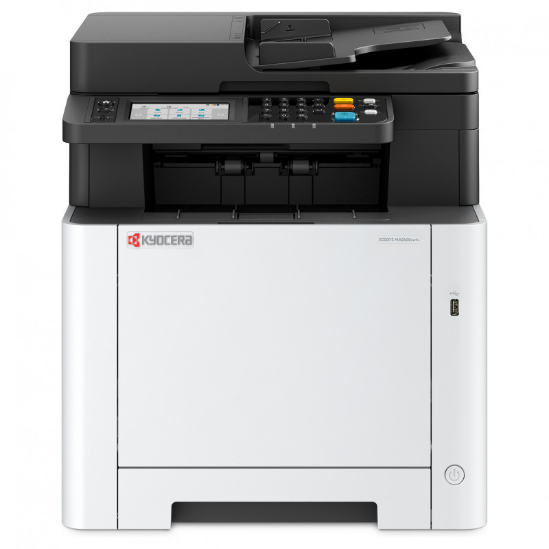 "KYOCERA ECOSYS MA2600cwfx. Print technology: Laser, Printing: Colour printing, Maximum resolution: 1200 x 1200 DPI, Print speed (colour, normal quality, A4/US Letter): 26 ppm. Copying: Colour copying, Maximum copy resolution: 600 x 600 DPI. Scanning: Colour scanning, Optical scanning resolution: 600 x 600 DPI. Faxing: Mono faxing. Duplex functions: Copy, Print, Scan. Maximum ISO A-series paper size: A4. Wi-Fi. Direct printing. Product colour: Black, White"\n"The ECOSYS MA2600cwfx is a compact and reliable 4-in-1 colour multifunctional for professional use. Engineered to offer maximum productivity to small and medium workgroups"