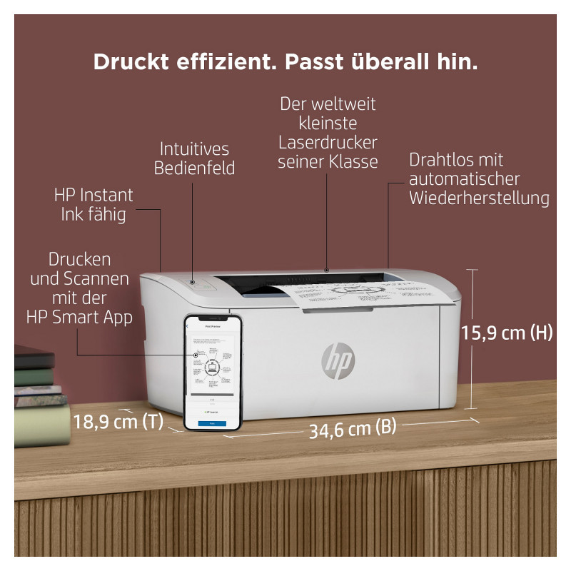 "HP LaserJet M110w Printer. Print technology: Laser. Number of print cartridges: 1, Maximum duty cycle: 8000 pages per month. Maximum resolution: 600 x 600 DPI. Maximum ISO A-series paper size: A4. Print speed (black, normal quality, A4/US Letter): 20 ppm. Display: LED. Network ready, Wi-Fi. Product colour: White"\n"Prints efficiently. Fits anywhere. An efficient, high-quality laser printer that fits your space and budget. Get fast printing from HP's smallest laser in its class,[1] plus the time-saving HP Smart app.[2,3] Count on professional-quality laser printing and seamless setup.