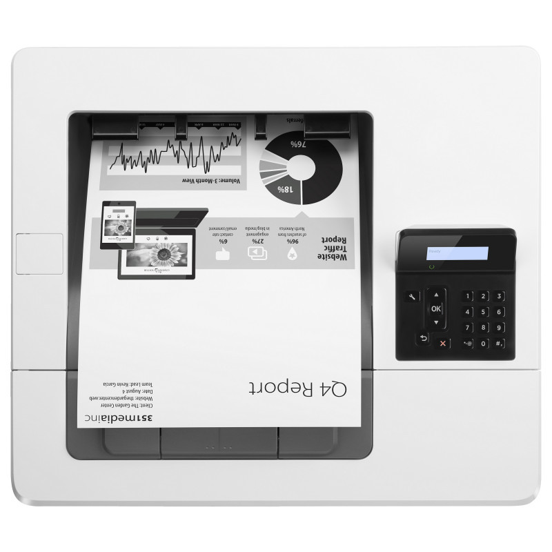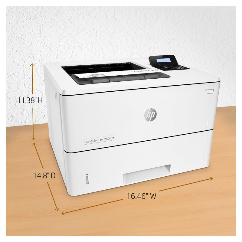 "HP LaserJet Pro M501dn. Print technology: Laser. Number of print cartridges: 2, Maximum duty cycle: 100000 pages per month. Maximum resolution: 600 x 600 DPI. Maximum ISO A-series paper size: A4. Print speed (black, normal quality, A4/US Letter): 43 ppm, Duplex printing. Display: LCD. Network ready. Product colour: White"\n" Put impressive print speeds and performance to work in your office. This energy-saving printer starts faster[1] and delivers security features to help guard against threats. Original HP Toner cartridges with JetIntelligence produce more pages.[2]