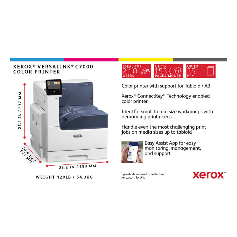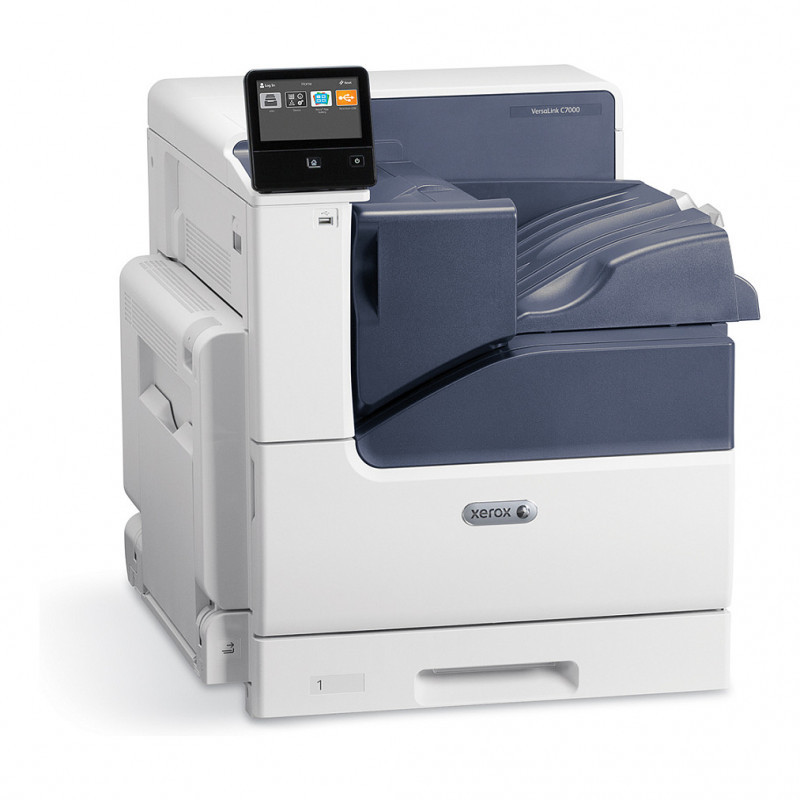"Xerox VersaLink C7000 A3 35/35 ppm Duplex Printer Adobe PS3 PCL5e/6 2 Trays Total 620 sheets. Print technology: Laser, Colour. Number of print cartridges: 4, Maximum duty cycle: 153000 pages per month. Maximum resolution: 1200 x 2400 DPI. Maximum ISO A-series paper size: A3. Print speed (black, normal quality, A4/US Letter): 35 ppm, Duplex printing. Display: LCD. Network ready. Product colour: White"\n"When you need your work to stand out from the rest, count on the VersaLink C7000 Colour Printer - featuring Xerox® ConnectKey® Technology. Ready for the way you want to work, the C7000 is mobile-ready, app-enabled and ready to customise. Meet your challenges head-on with the VersaLink C7000 - your modern workplace assistant."