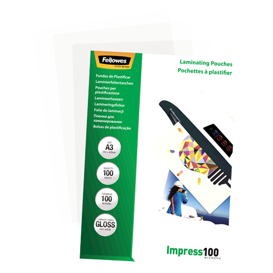 Fellowes | Laminating Pouch | A3 | Glossy | Thickness: 100 micron, Qty Per Pack: 100 pcs; Ideal for notices, craft materials, signage and frequently handled documents; Compatible with all laminator brands